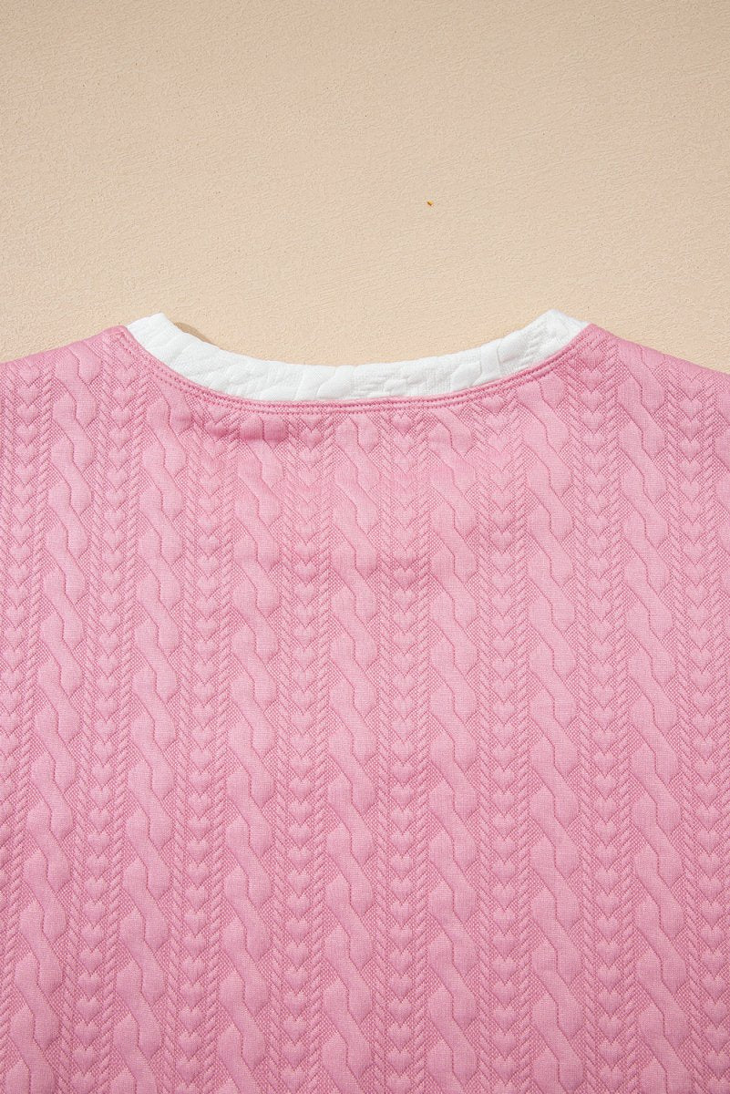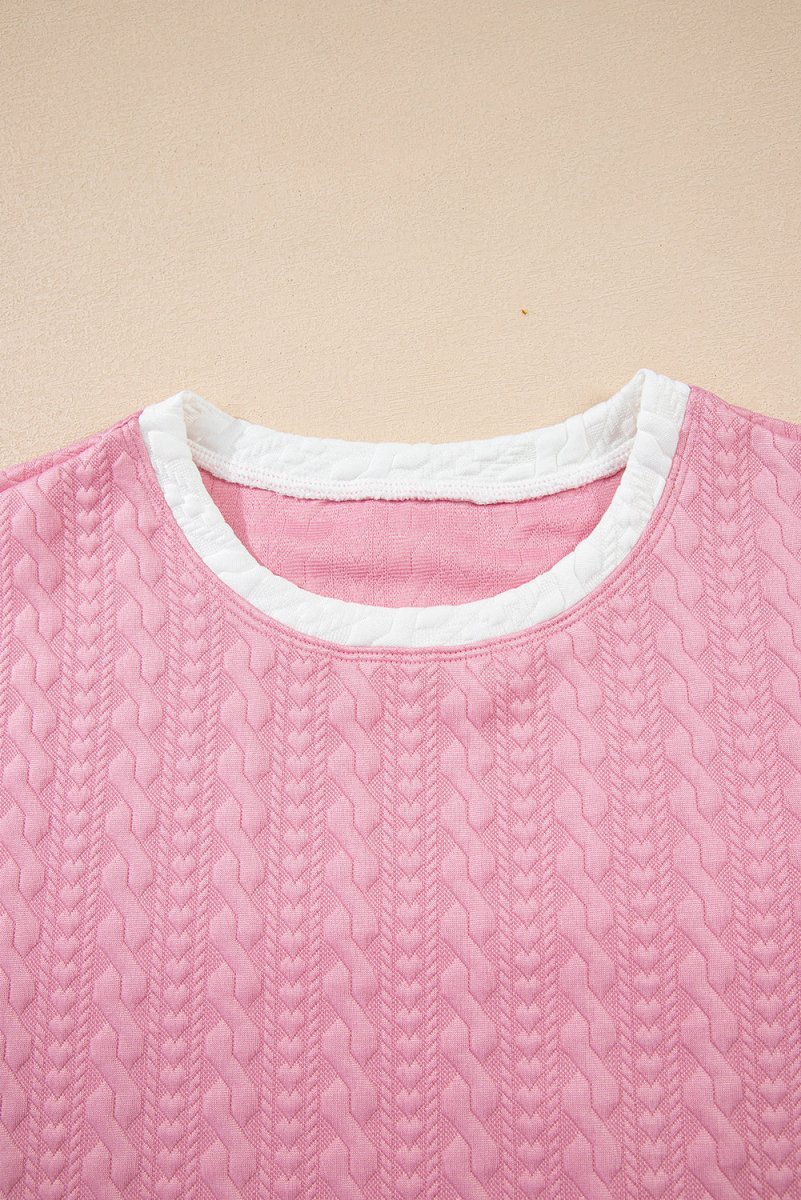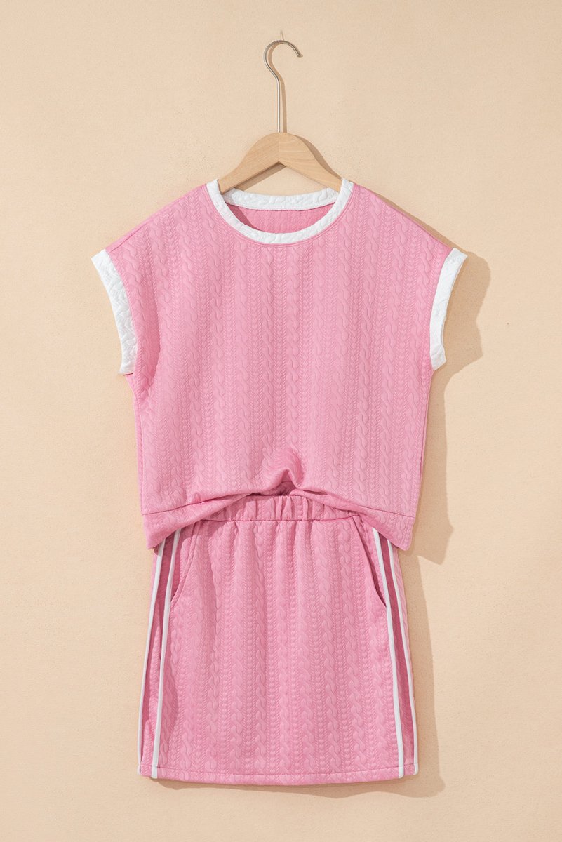 Pink Contrast Trim Textured Crewneck Tee And Pocketed Skirt Set