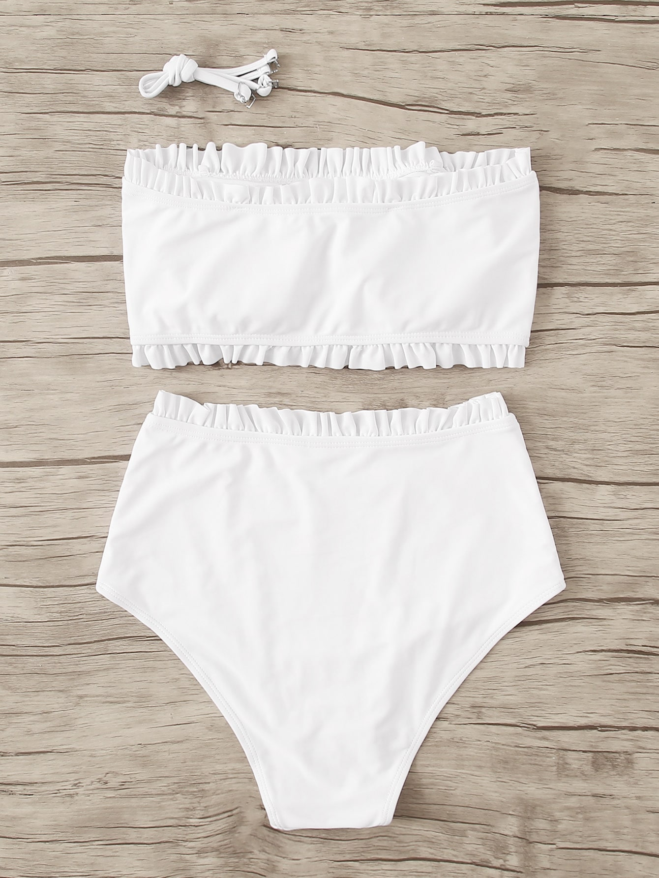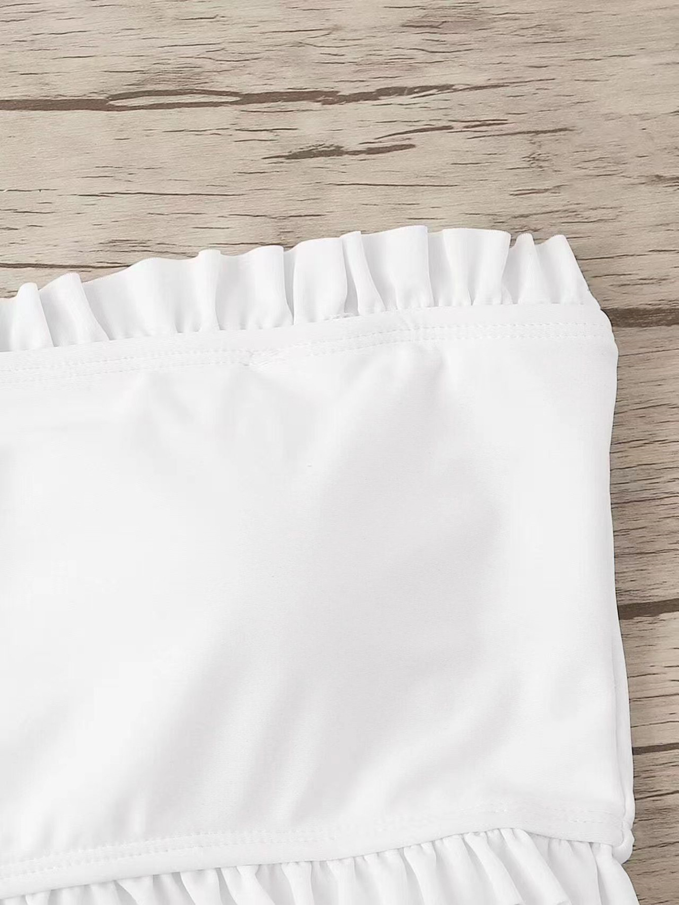 This two-piece swimsuit features a strapless bandeau-style top with delicate ruffle trim along the neckline and a matching bottom. The solid white design offers a clean, minimalist silhouette suitable for summer vacations.
