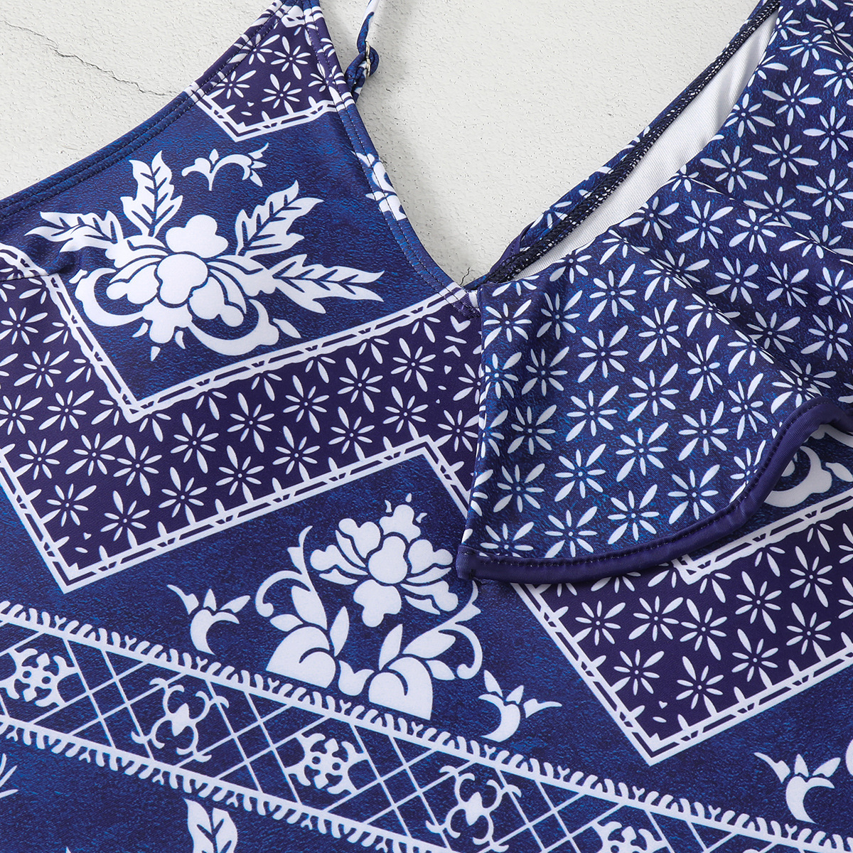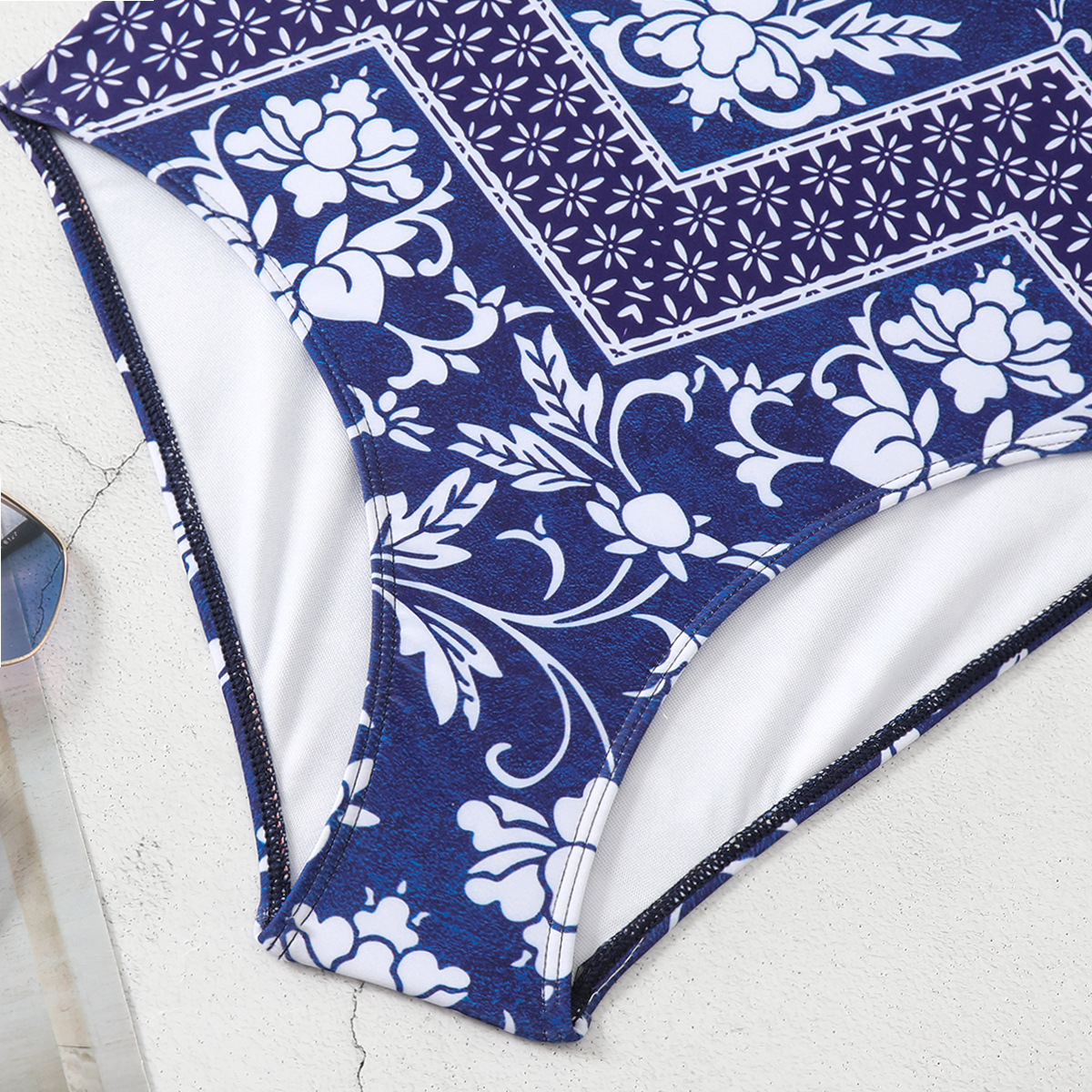 Fabric and finish: Made from polyester, this swimsuit offers durable construction and a smooth feel. The floral print combines navy blue and white hues for a versatile summer aesthetic.