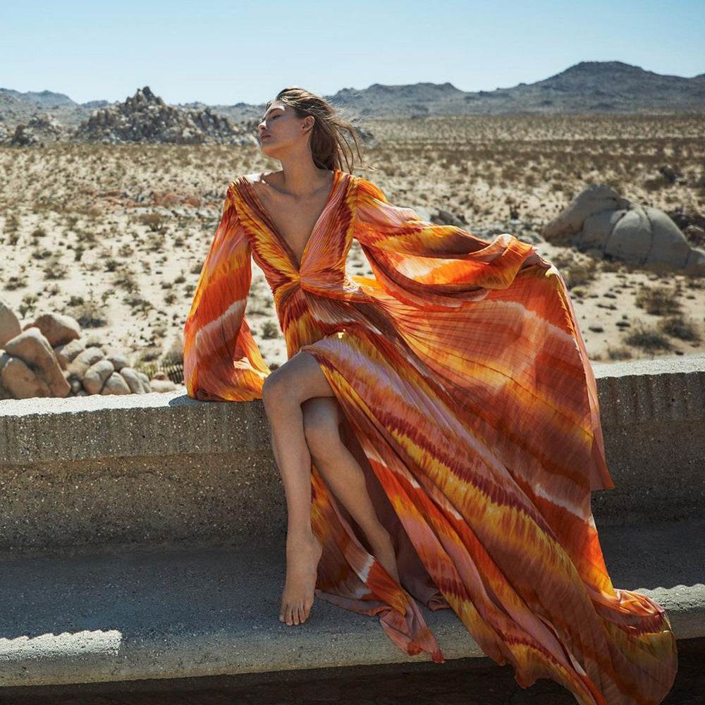 This V-neck long sleeve one-piece swimsuit blends boho style with vacation-ready practicality. Crafted from polyester, it offers a lightweight, quick-drying fabric designed for sun, sand, and surf. The tie-dye pattern features warm orange and yellow tones for a vibrant, sunset-inspired look on the beach or by the pool.