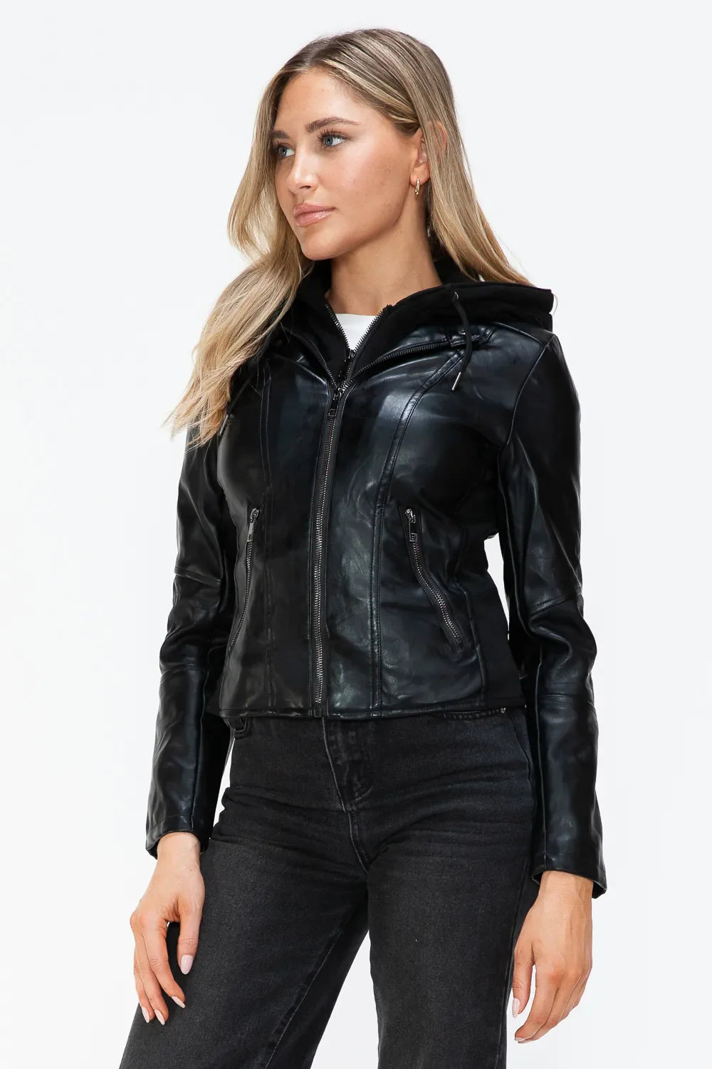 Snobbish Faux Leather Zip Up Drawstring Hooded Jacket