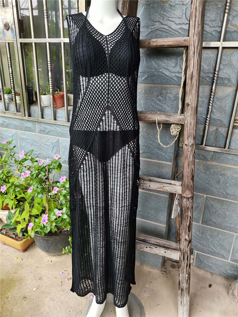 Crafted for warm-weather escapes, this knitted beach cover-up delivers a boho-inspired, vacation-ready silhouette. The sleeveless maxi overlay features hollow-out cutouts in a solid pattern, creating visual interest while remaining lightweight. Made from jersey fabric with a polyester composition, it drapes fluidly over swimsuits and breezes with the comfort of a regular fit.