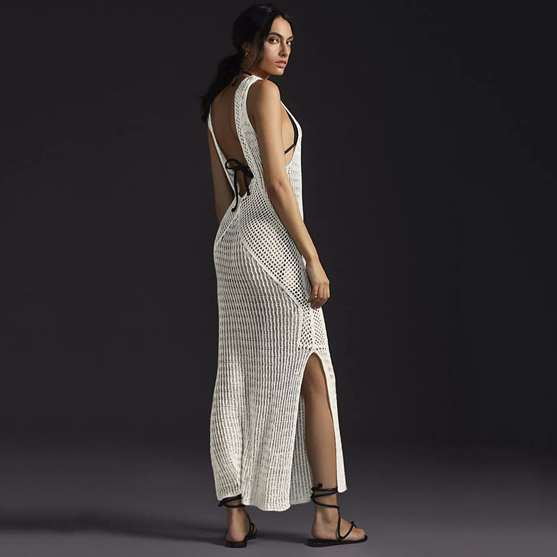 Knitted Beach Cover-up with Hollow-Out Cutouts and Maxi Split