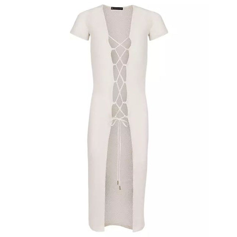 Summer Beach Dress Women Solid Color Lace-Up Hollow Out Cover-Up