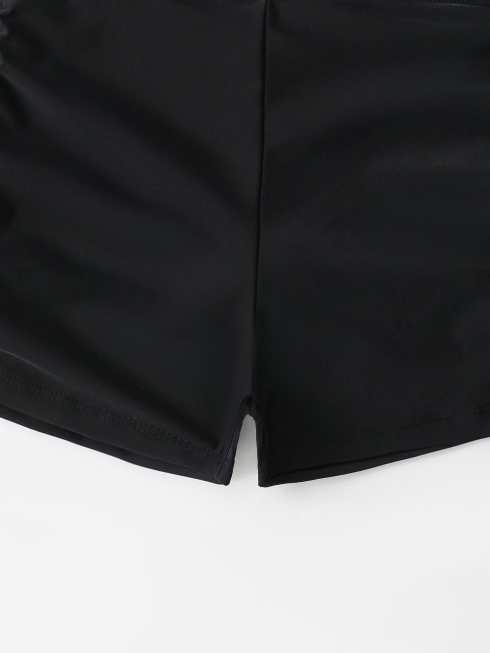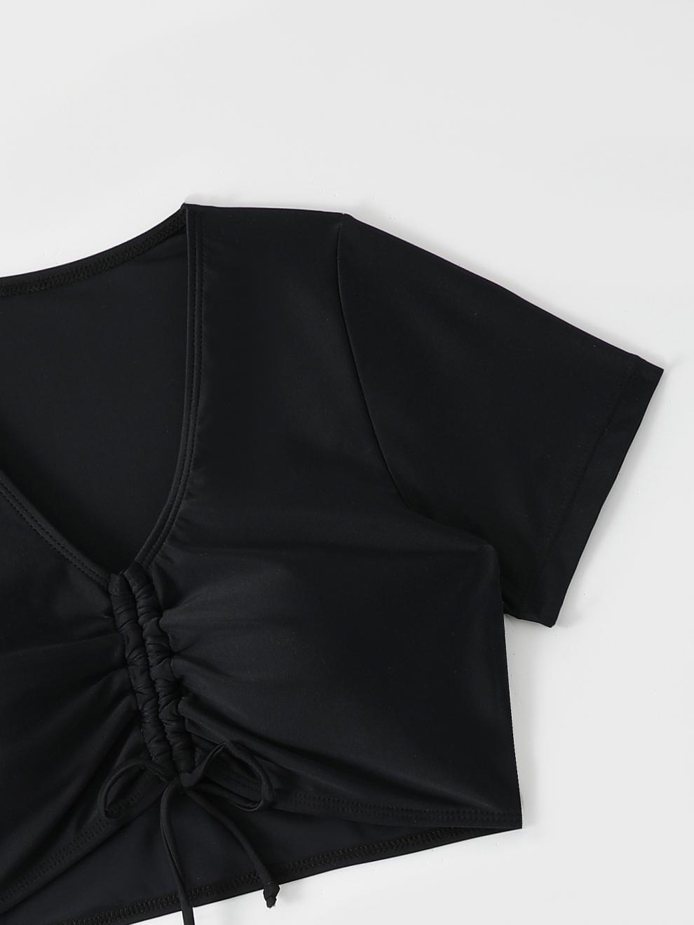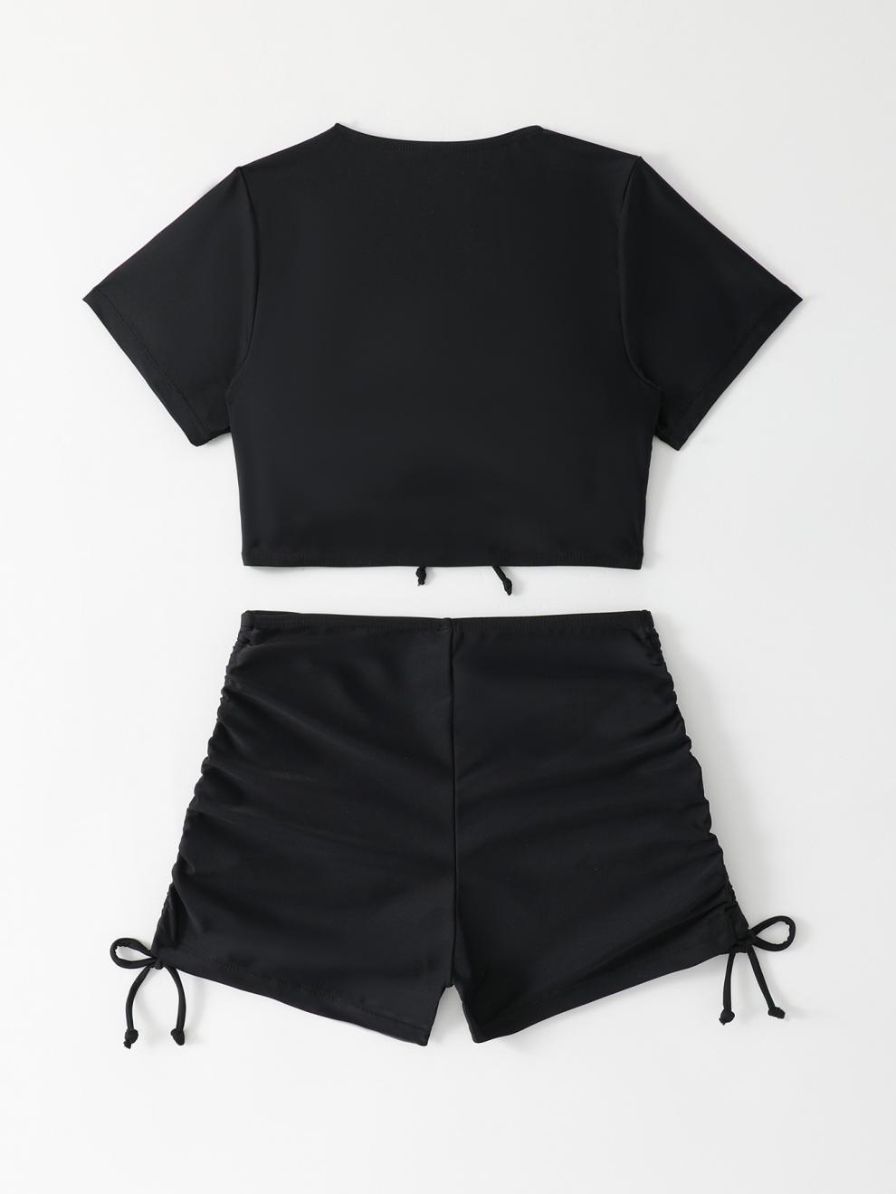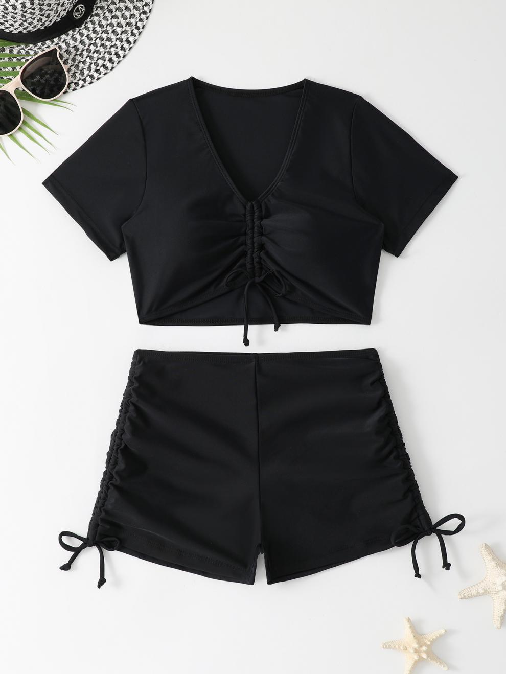 This two-piece swimsuit blends a cropped, short-sleeve tie-front top with high-waisted shorts for a modest, contemporary look. Made from nylon for a soft feel and quick-drying performance, it suits summer vacations and pool days. The solid pattern keeps the silhouette clean, while ruched detailing at the center front adds texture. The adjustable tie at the neckline offers customizable coverage, and the bottom features side drawstrings for a tailored fit.