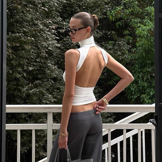 Women Clothing Summer Elegant Sleeveless Solid Color Turtleneck Backless Top