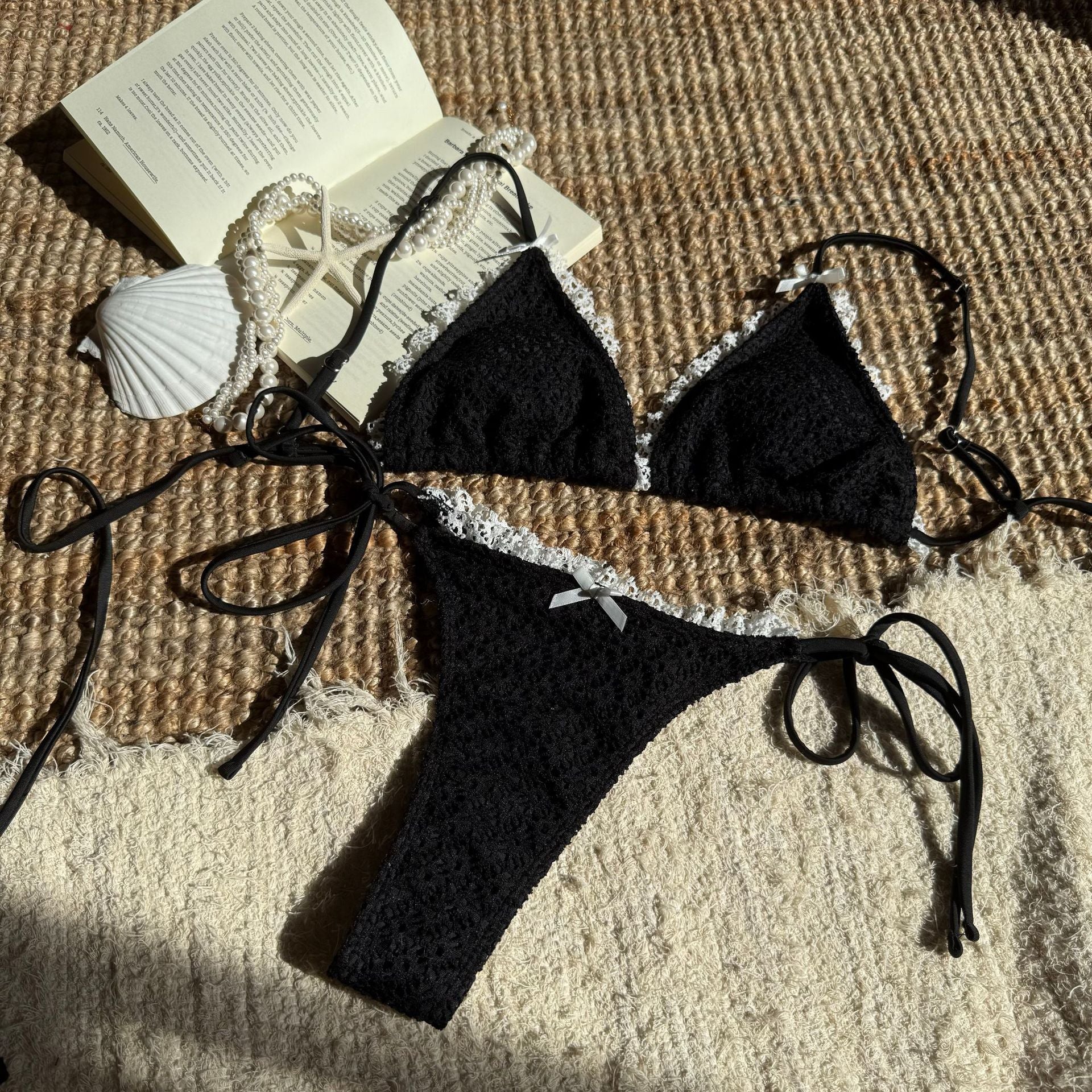 Contrast Color Bow Flounce Trim Lace up Sexy Backless Split Swimsuit Bikini