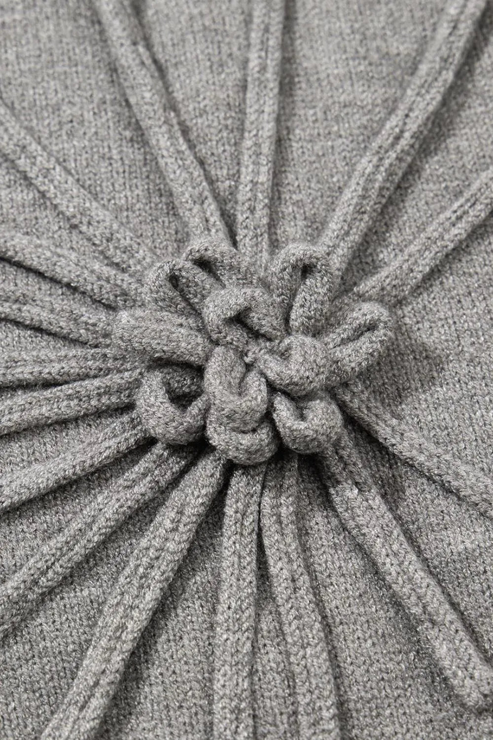 This gray knit sweater features a prominent floral embroidery on the front, adding texture to a modern boxy silhouette. Short sleeves and a ribbed trim provide a clean, versatile look suitable for layering or standalone wear. The fabric offers a slight stretch for comfortable movement while maintaining shape through daily use.