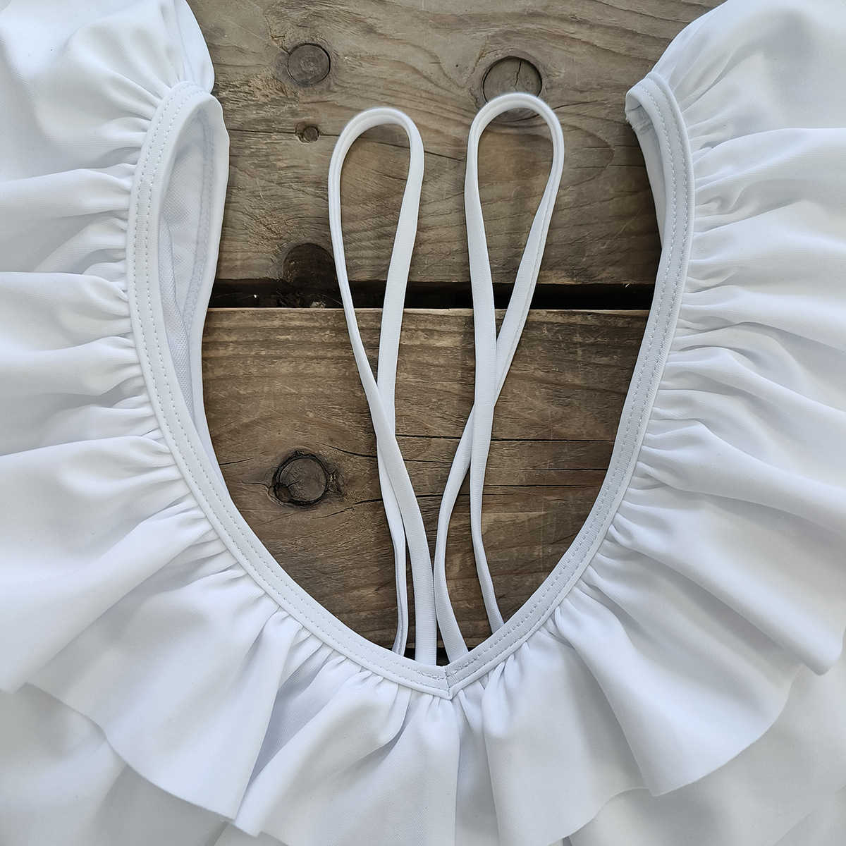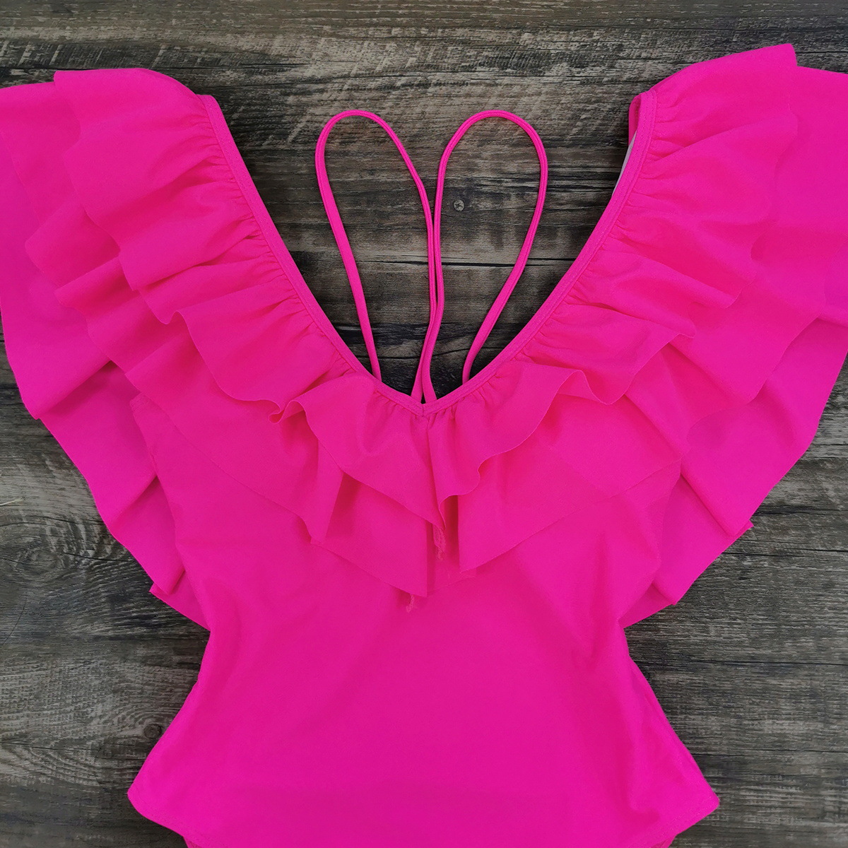 Solid Color Double Layer Ruffled Deep V Plunge Spaghetti Straps One Piece Swimsuit Women Swimsuit