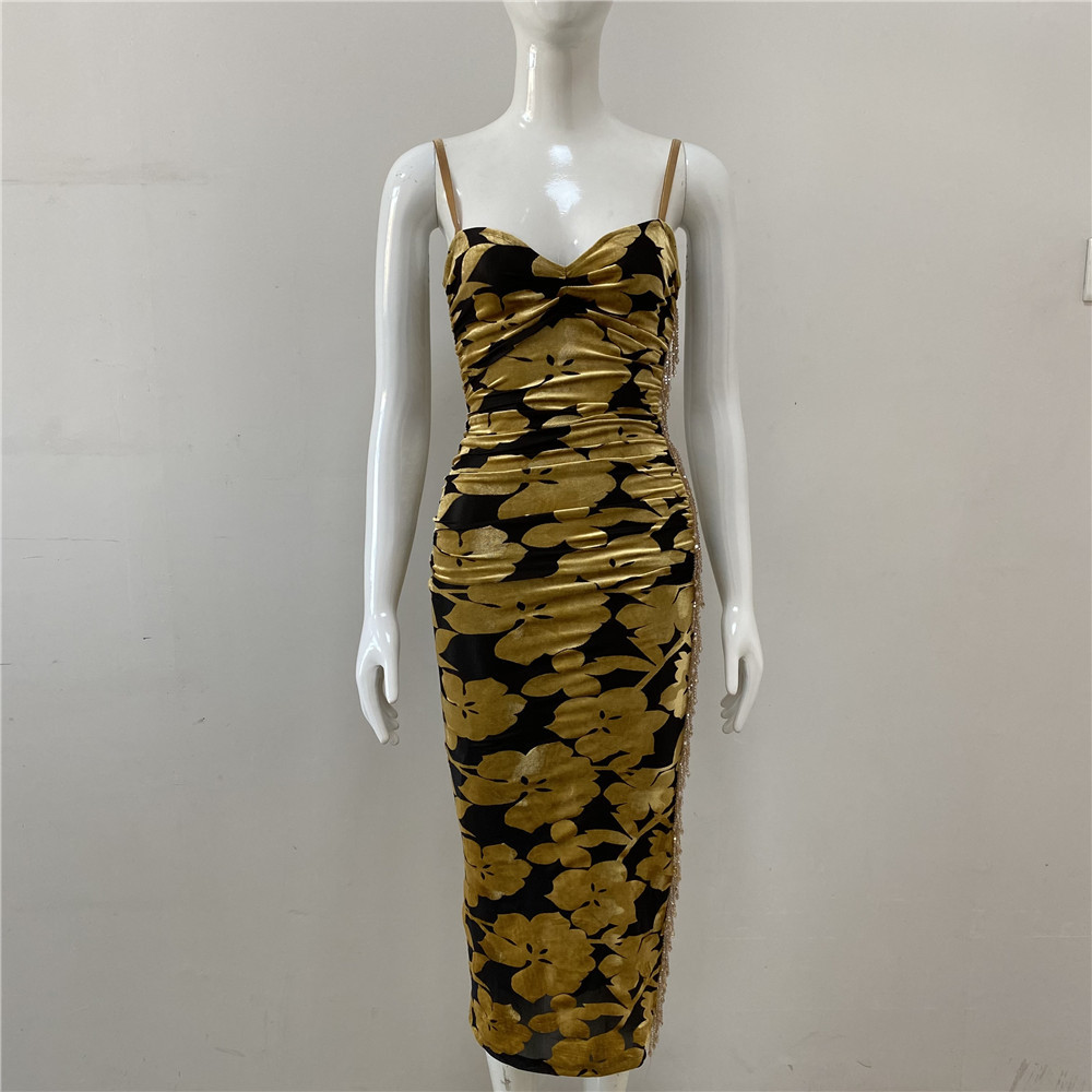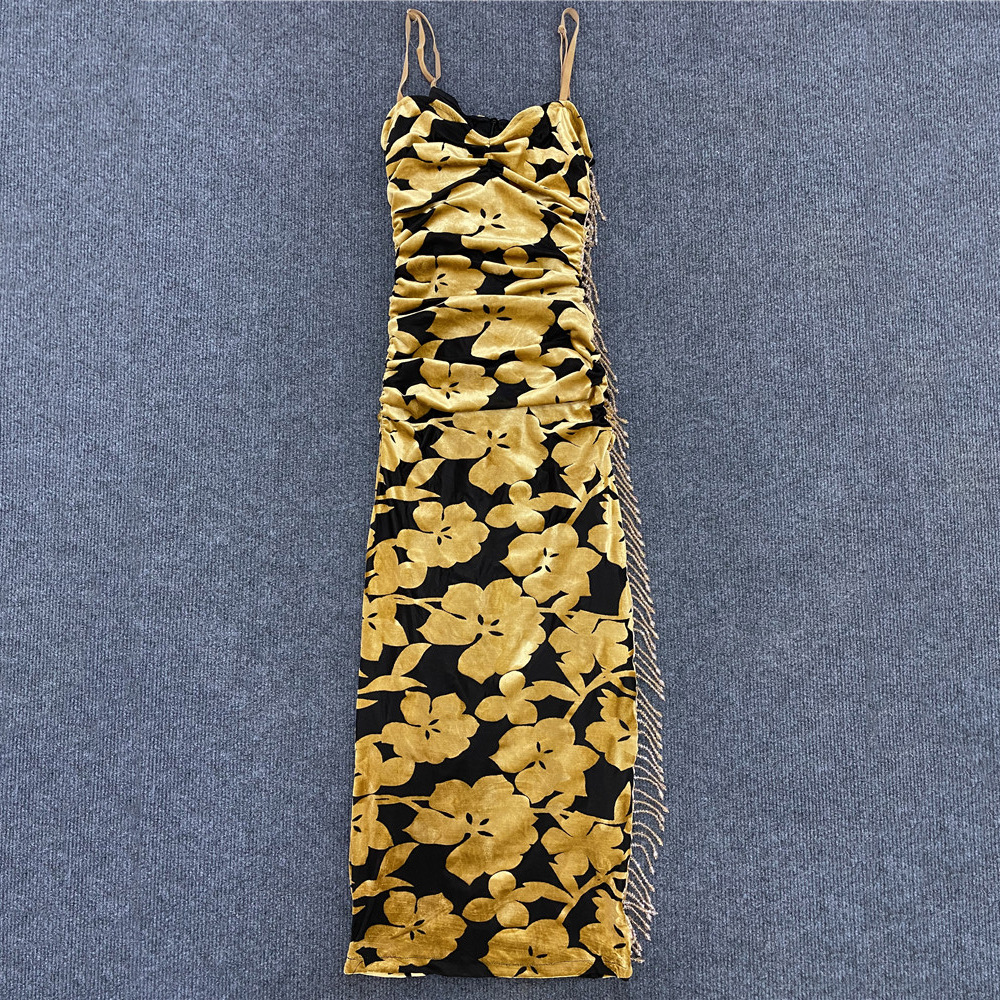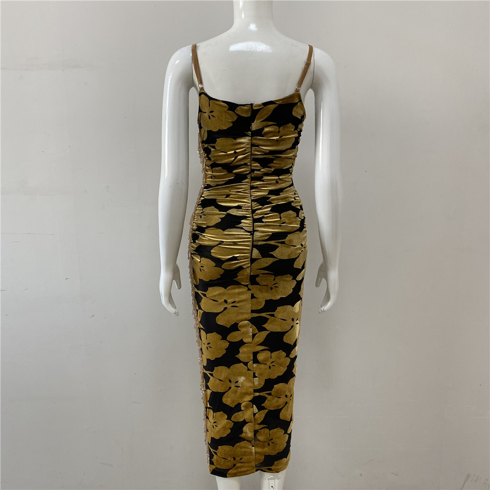 Summer V neck Velvet Cami Dress Sexy Pleated Beaded Tassel Printed Midi Dress