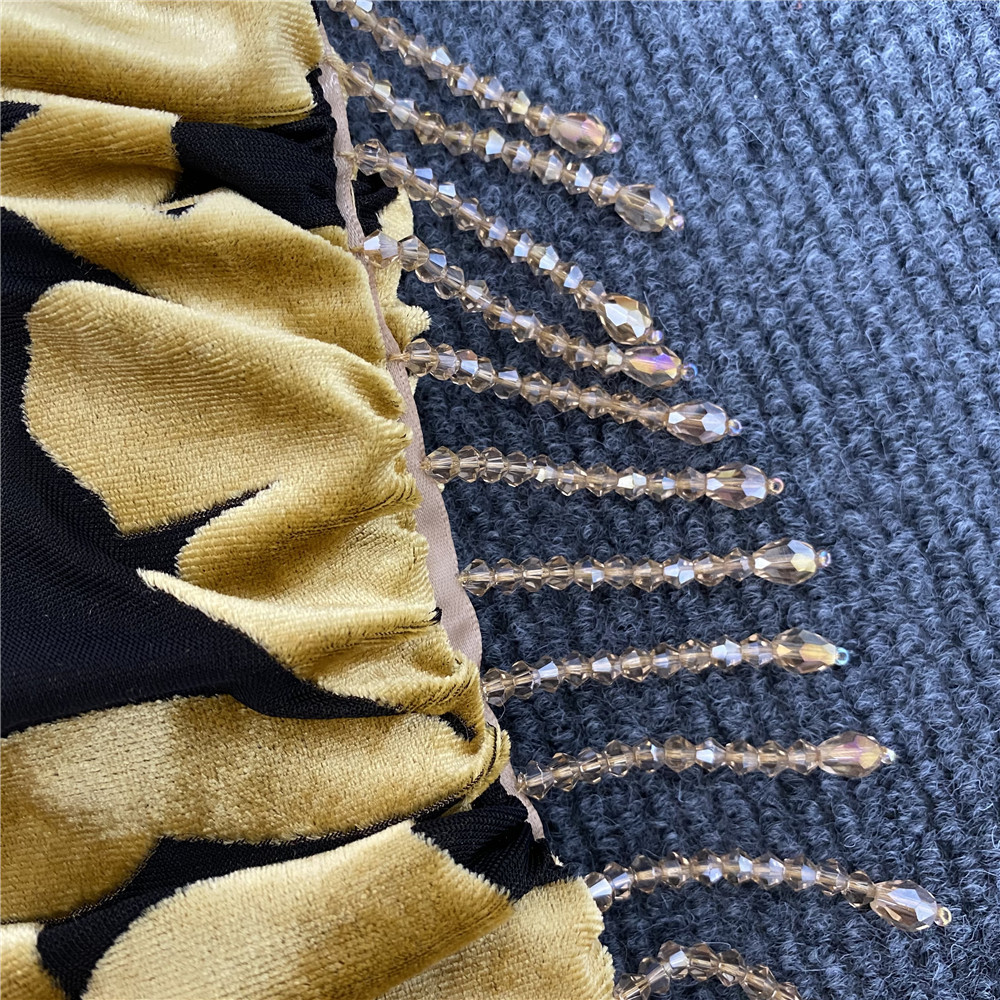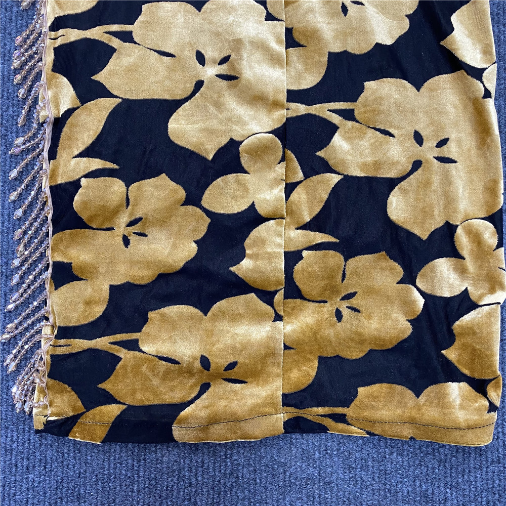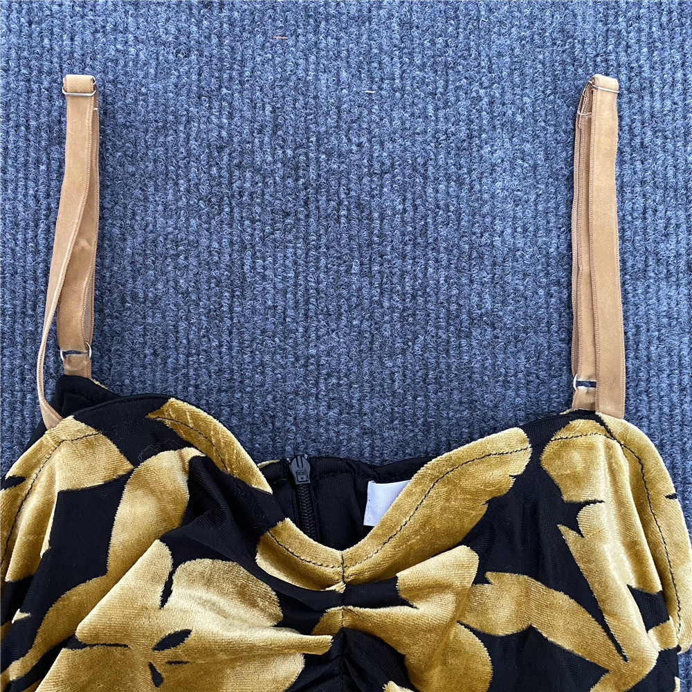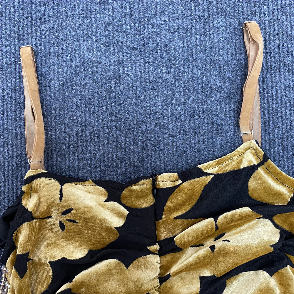 Summer V neck Velvet Cami Dress Sexy Pleated Beaded Tassel Printed Midi Dress
