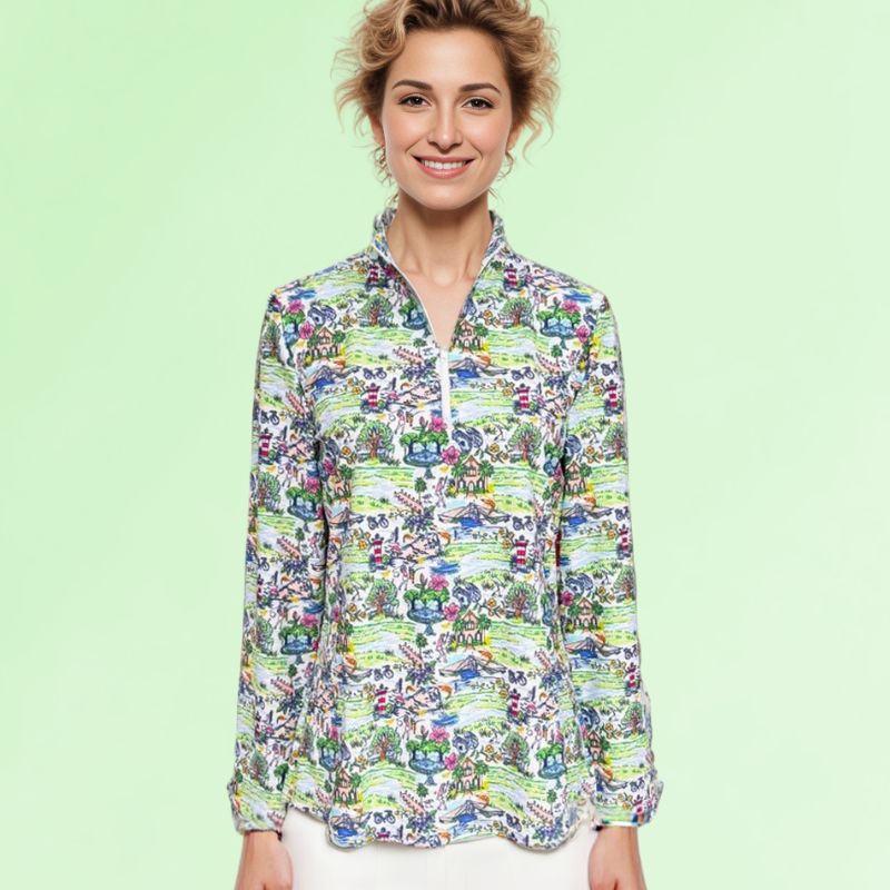The Anna Maria Pullover from Katherine Way offers a comfortable, versatile athleisure option for everyday wear. This quarter-zip pullover is designed for ease of movement and year‑round use, making it a dependable addition to any wardrobe. Its streamlined silhouette and tailored hem create a polished look that pairs smoothly with skorts or casual bottoms.