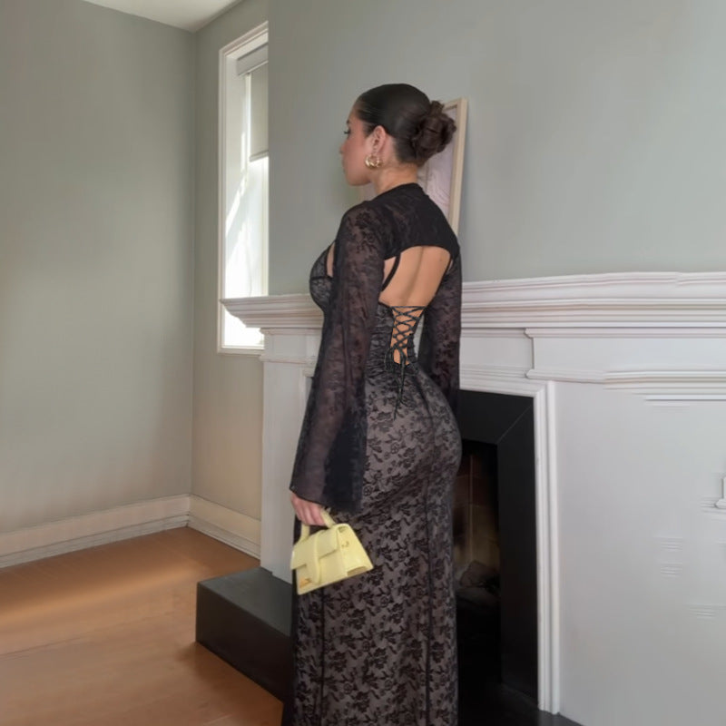 Designed for evenings and celebrations, this black maxi dress pairs a slim, body-skimming fit with intricate floral lace. The main fabric is polyester, delivering a comfortable stretch and durable wear. A lace-up back detail and a backless profile create a refined, contemporary look, while long trumpet sleeves add a touch of drama. The floral lace pattern delicately overlays the silhouette, offering tasteful texture and depth for a sophisticated appearance. The dress is cut to a maxi length for a fluid, elegant drape that moves with you. Product images show the garment from multiple angles to illustrate the lace detail and silhouette.