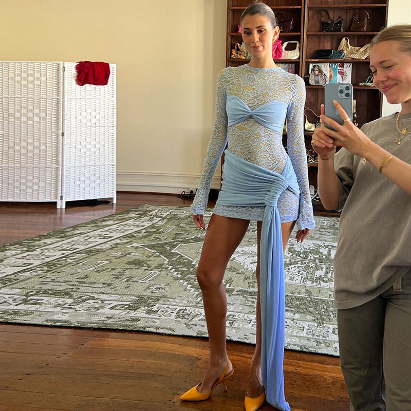 Autumn Winter Women Clothing Sexy round Neck Lace Stitching Long Sleeve Slim Fit Dress