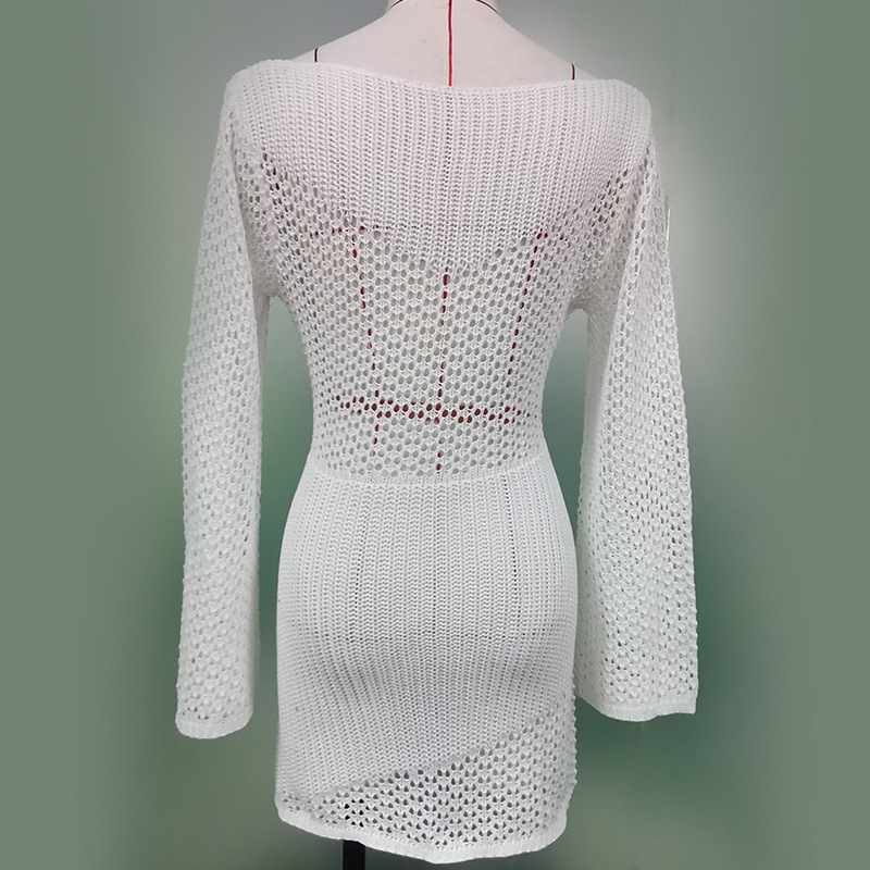 Beach Dress Women Knitted Hollow Out Cutout Sexy Cropped off Shoulder Wrapped Chest Long Sleeve Slim Beach Dress for Women