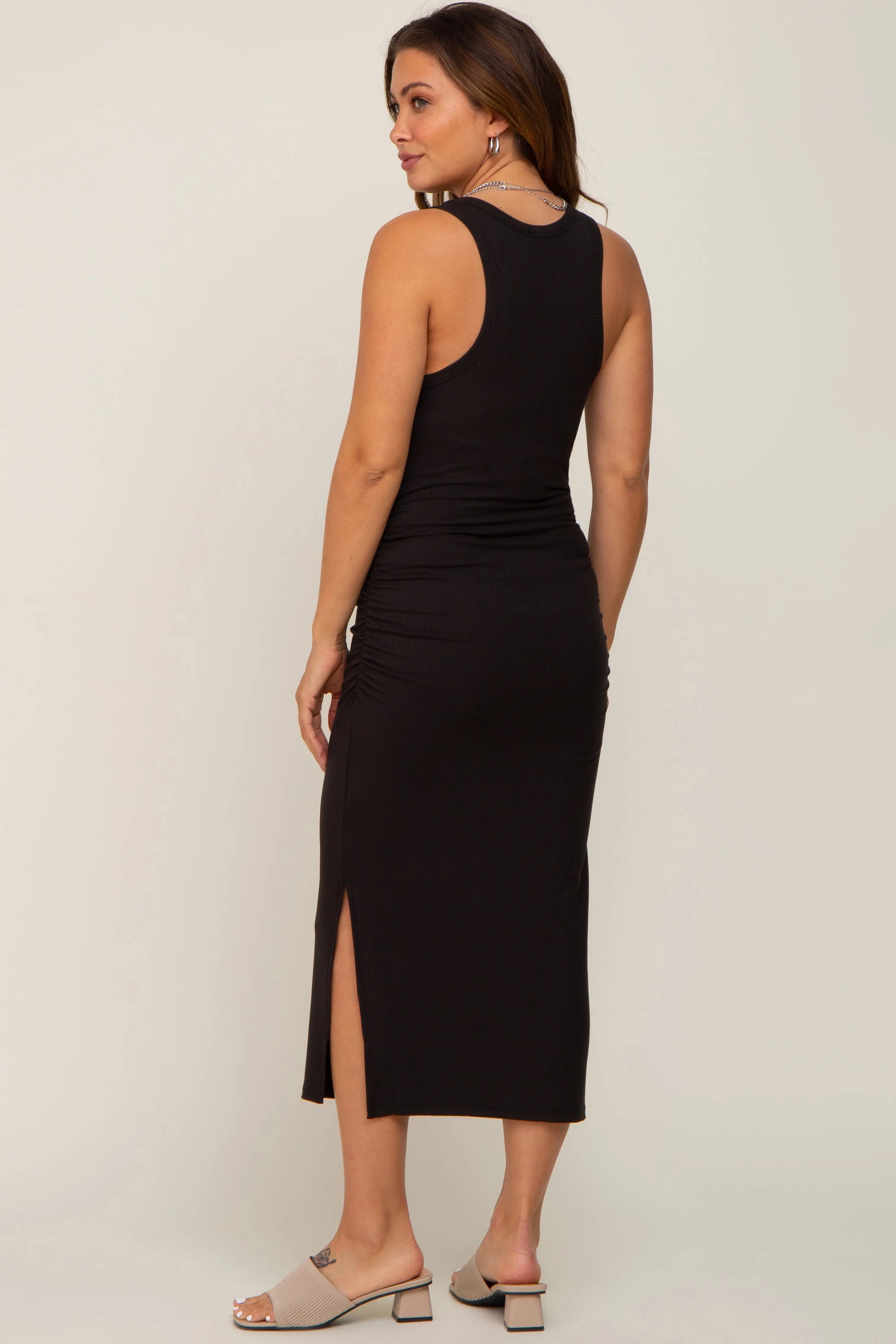 A sleeveless ribbed maternity midi dress featuring side ruching, a side slit and a rounded neckline.