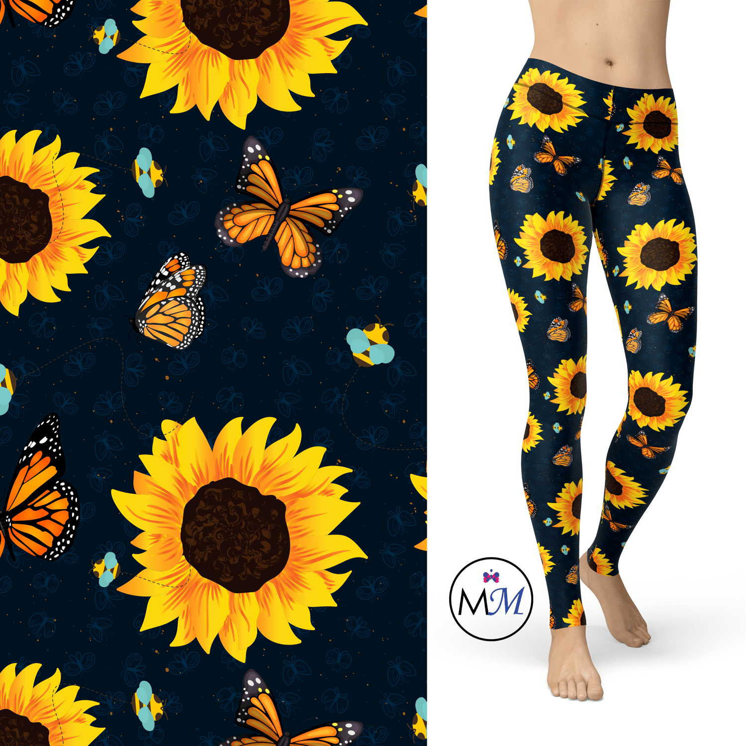 I spent a very long time making these. I wanted to get the bumblebee and butterflies to complement the sunflower. The background is dark peacock blue which is a mix of dark blue and teal. There are light butterflies embedded and yellow specks. These are custom made leggings extremely soft leggings made with 92% polyester and 8% spandex.
