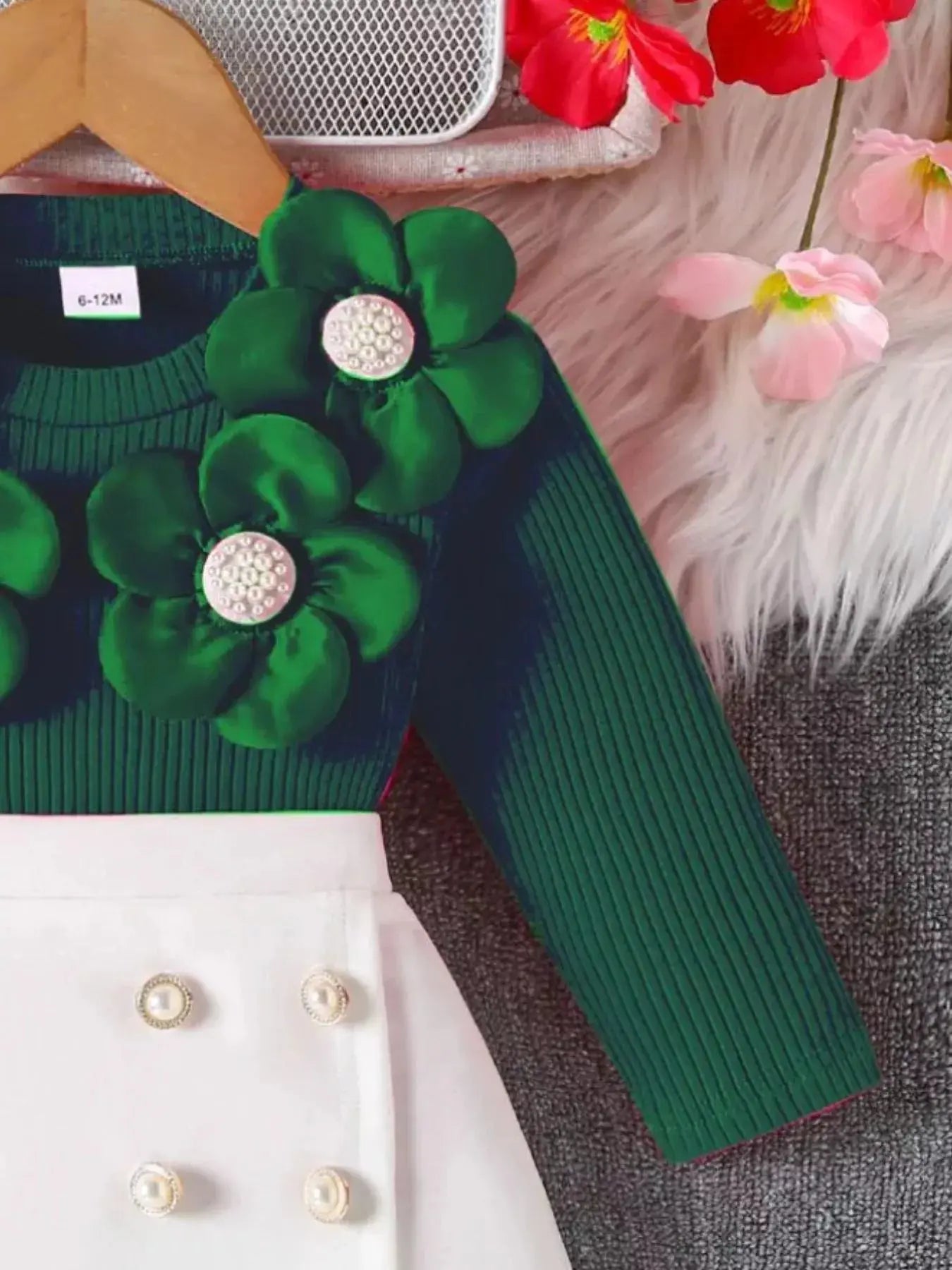 Children's Floral Applique Ribbed Top & Button Decor Skirt Set