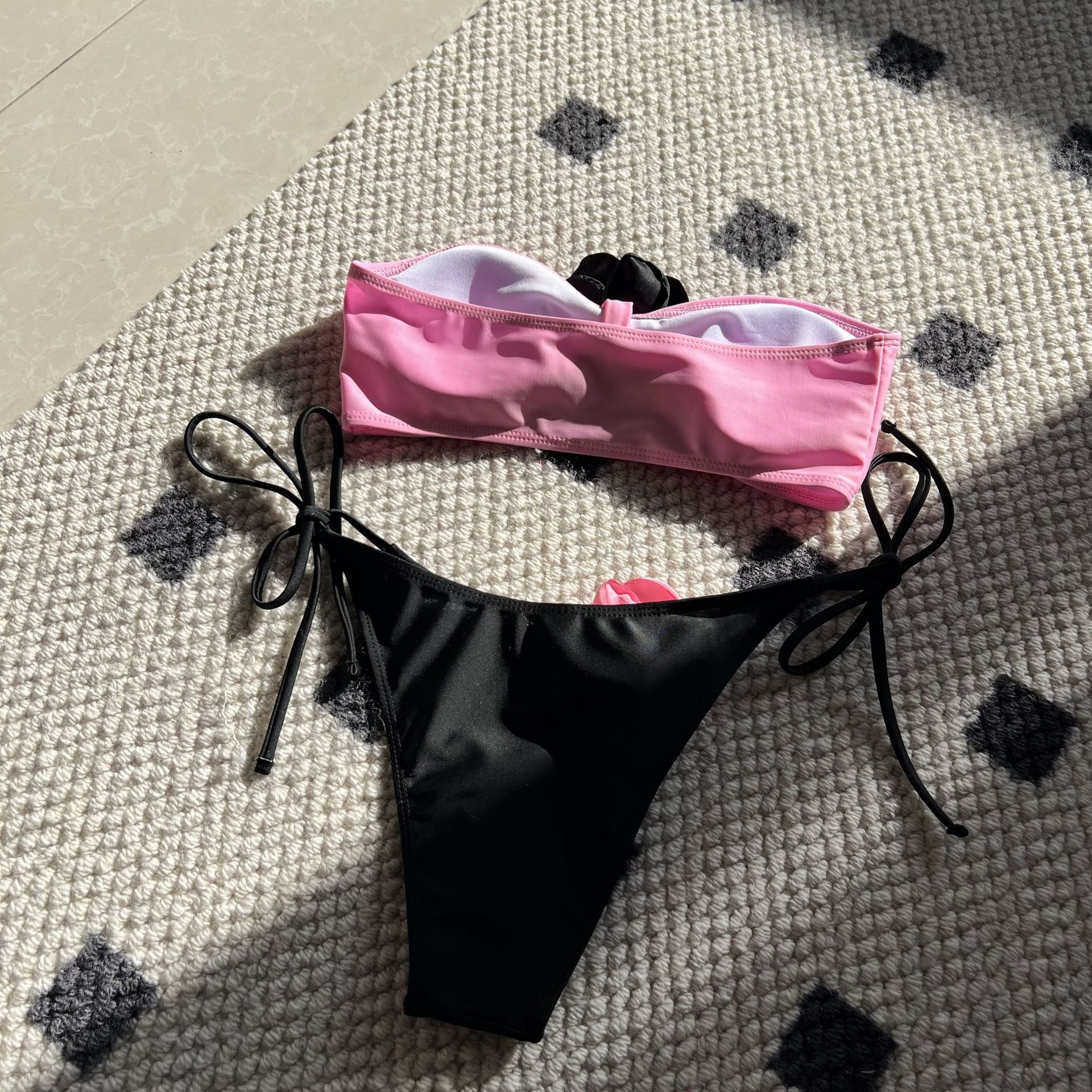 Color Matching Rose Tube Top Lace up Drawstring Strap Split Swimsuit Bikini