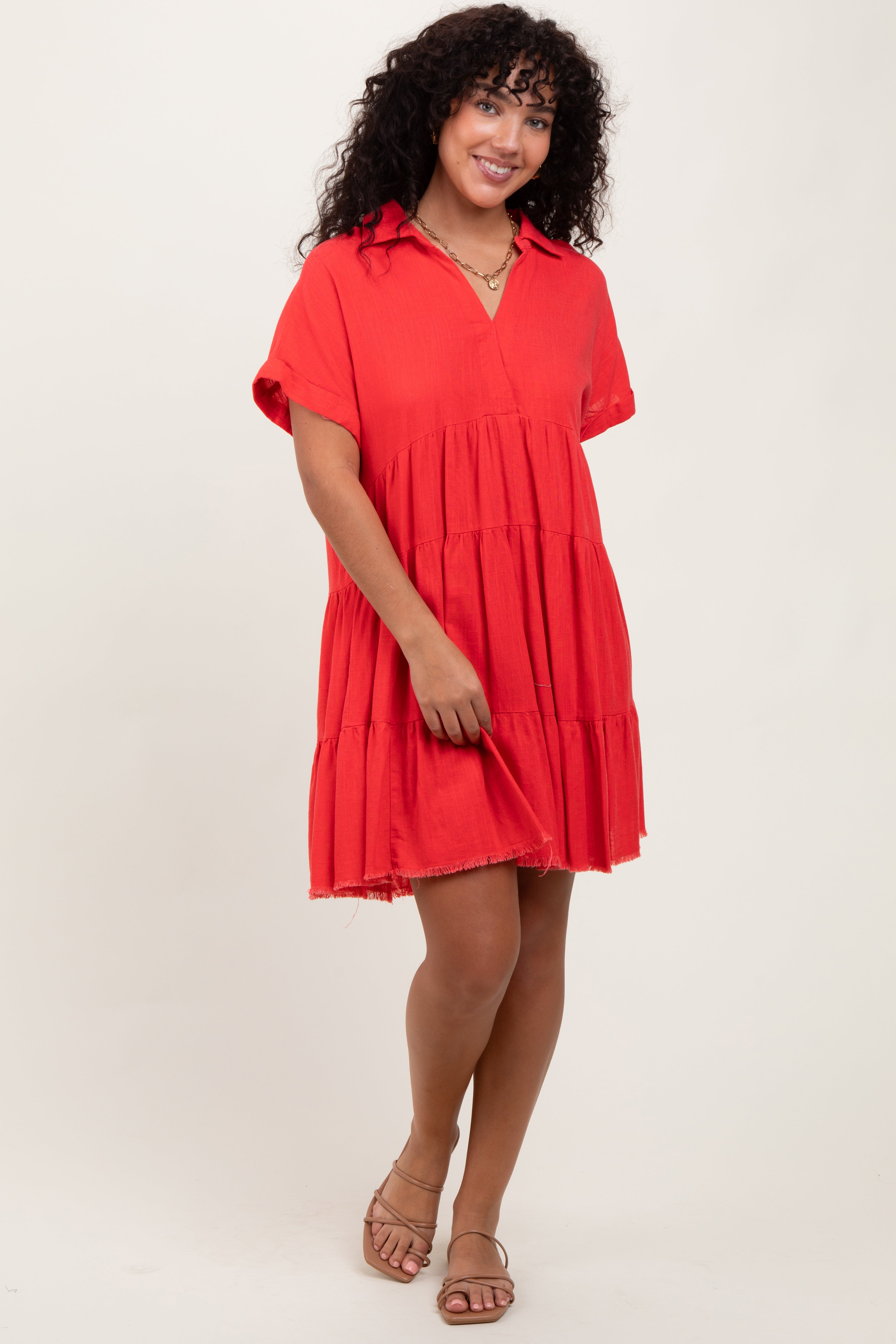Coral Tiered Linen Dress