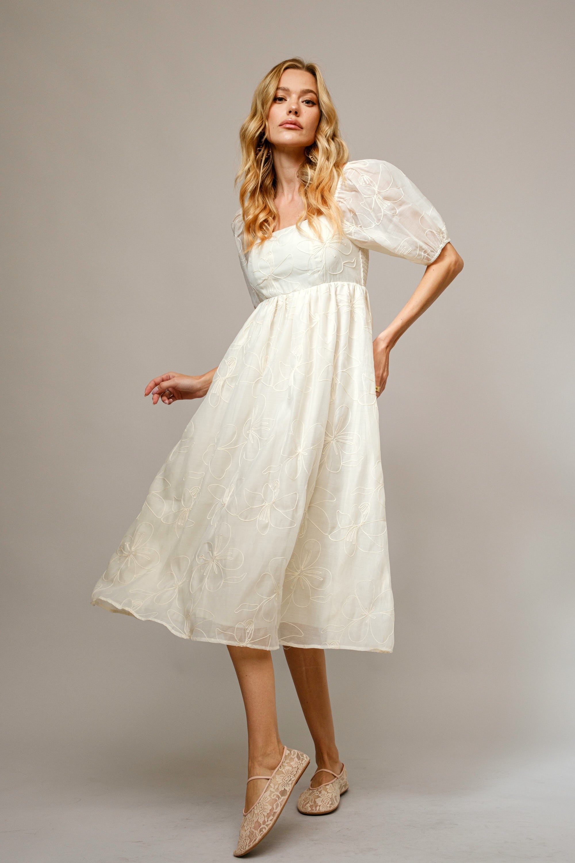 Cream Embroidered Floral Puff Sleeve Maternity Midi Dress