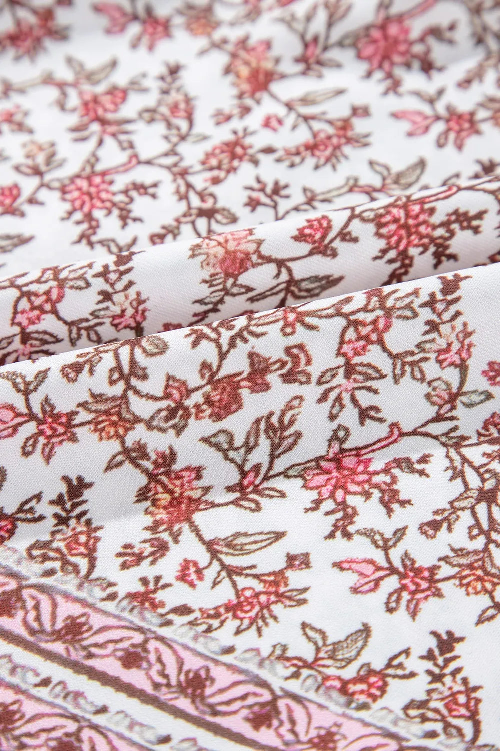 Lightweight, sleeveless top crafted from 100% polyester with a soft, draped silhouette. The scoop neckline is complemented by gentle pleats at the bust, creating a relaxed, flowy fit. The fabric is opaque to provide coverage without transparency. A floral print covers the body with a decorative border along the hem for subtle detailing. The top is machine washable in cold water and can be tumble dried on low. Imported.