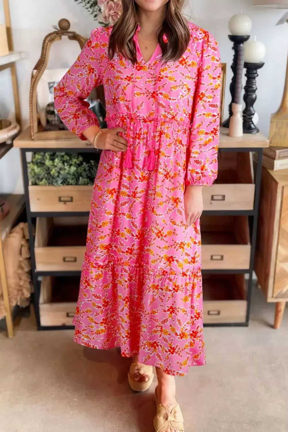 Floral Print Tie Neck Midi Dress Simply Love