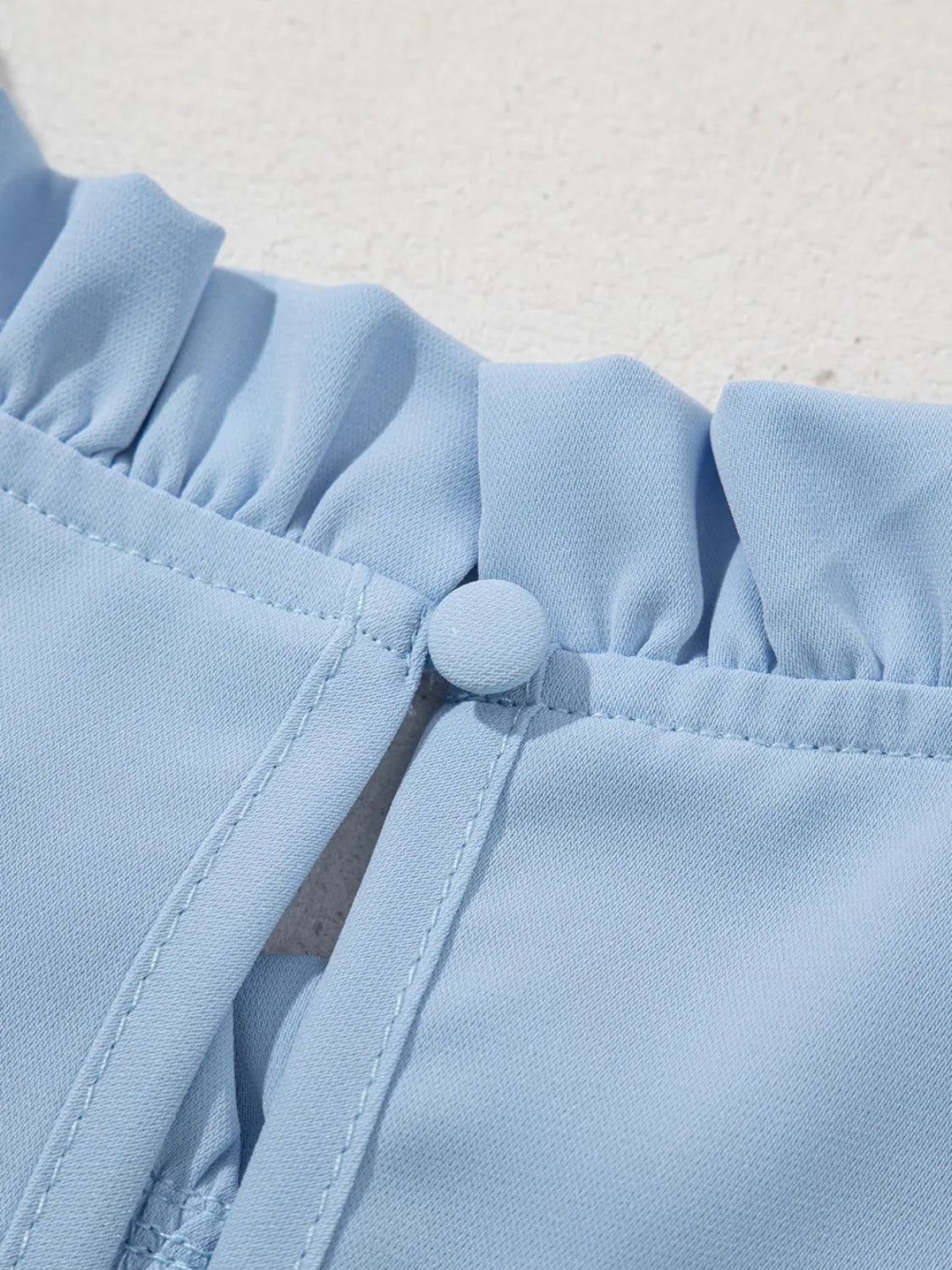 Crafted from 100% polyester, this light blue solid blouse offers a refined, feminine silhouette with a delicate frill at the round neckline and ruffled cuffs on the half sleeves. The non-stretch fabric drapes smoothly for comfortable, everyday wear and pairs well with denim, skirts, or tailored bottoms. Imported and easy to care for, this blouse blends effortless style with practical practicality for workdays or weekends.