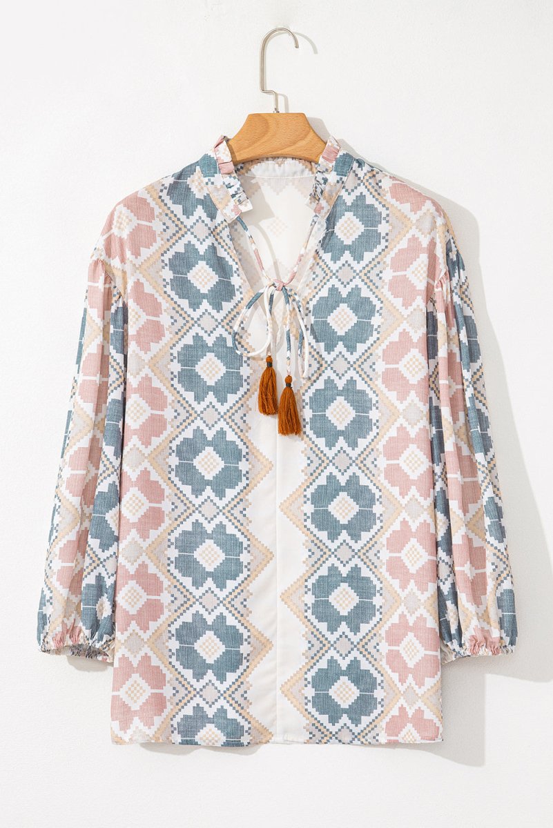 Khaki Geometric Print Tassel Tie Split Neck Balloon Sleeve Blouse