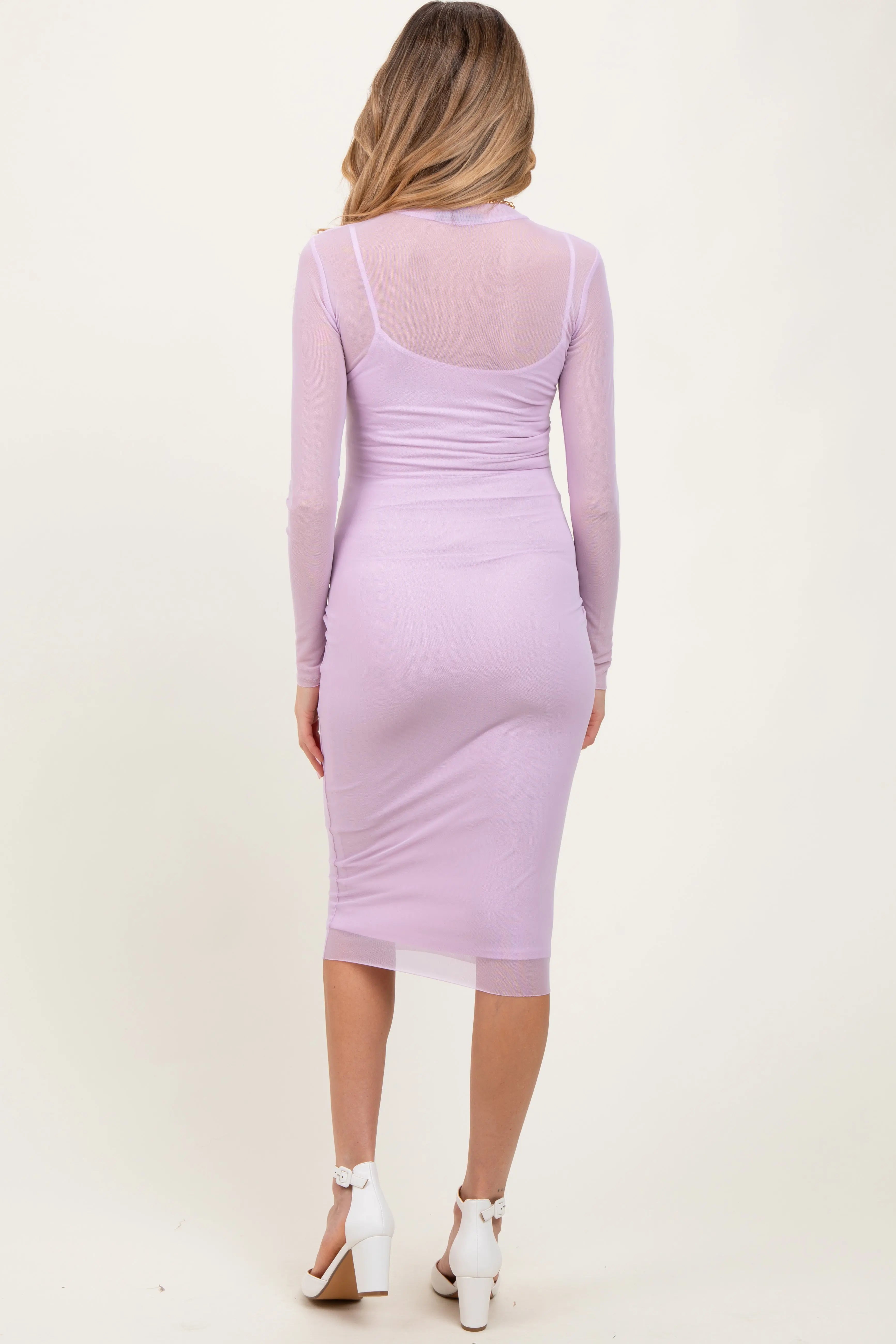 Elevate your maternity wardrobe with this fitted midi dress featuring a delicate mesh overlay. Designed to comfortably hug your growing bump, this dress offers a sleek silhouette with breathable, stretchy fabric for all-day comfort. The high neckline and long sleeves add a touch of elegance, while the midi length ensures a flattering fit through every stage of pregnancy. Perfect for special occasions or stylish everyday wear, this dress combines sophistication with practicality to make you feel confident and radiant. Pair it with your favorite heels or flats for a complete look.