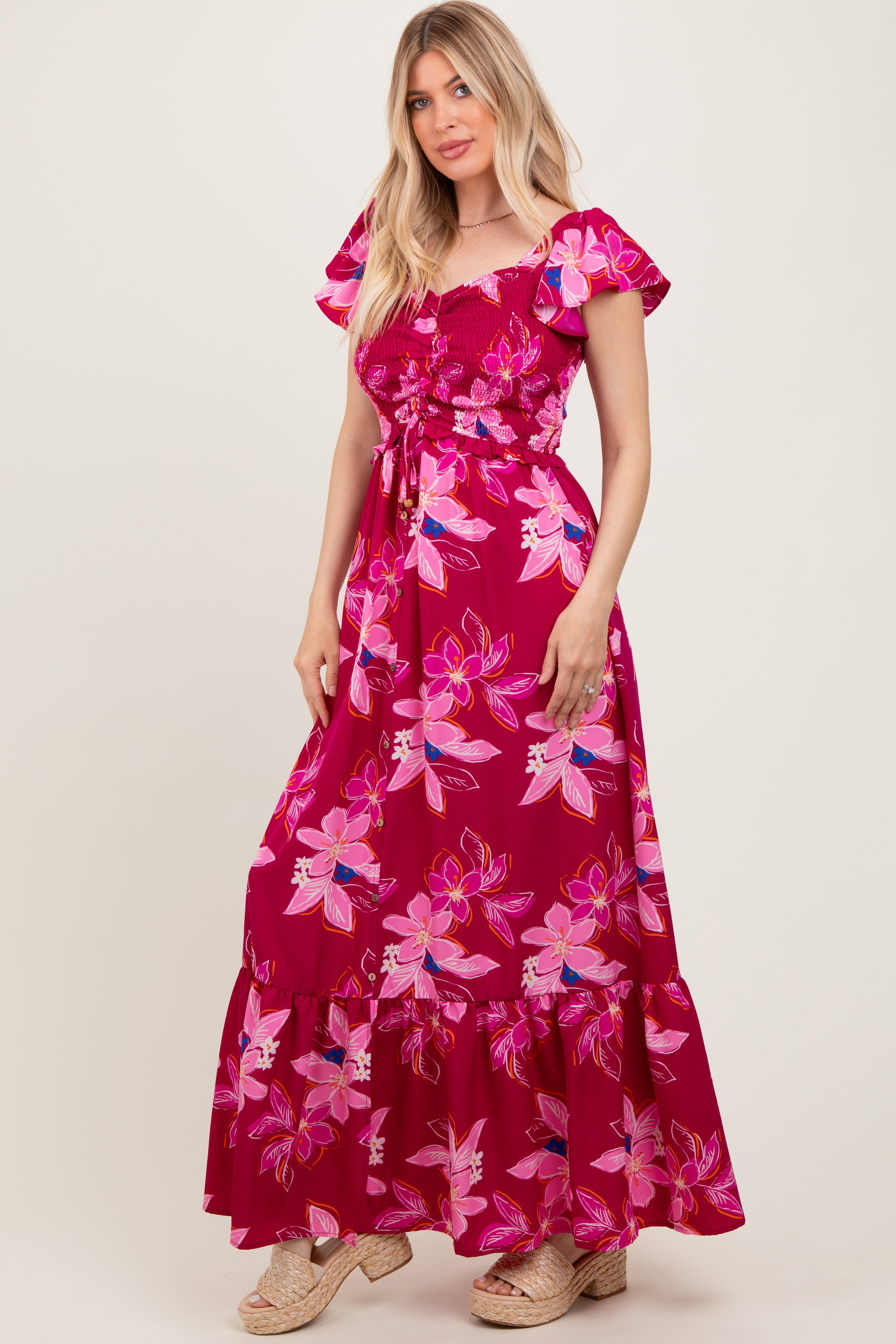 Embrace effortless style with this stunning floral maxi dress featuring a smocked cinched top for a flattering fit. The sweetheart neckline and flutter sleeves add a touch of feminine charm, while the flowy skirt with a ruffled hem creates graceful movement. Perfect for any occasion, this dress combines comfort and elegance with its lightweight fabric and vibrant floral pattern. Pair it with wedges or sandals for a chic, breezy look that’s ideal for warm days or a casual evening out. A must-have addition to your wardrobe that exudes confidence and style.