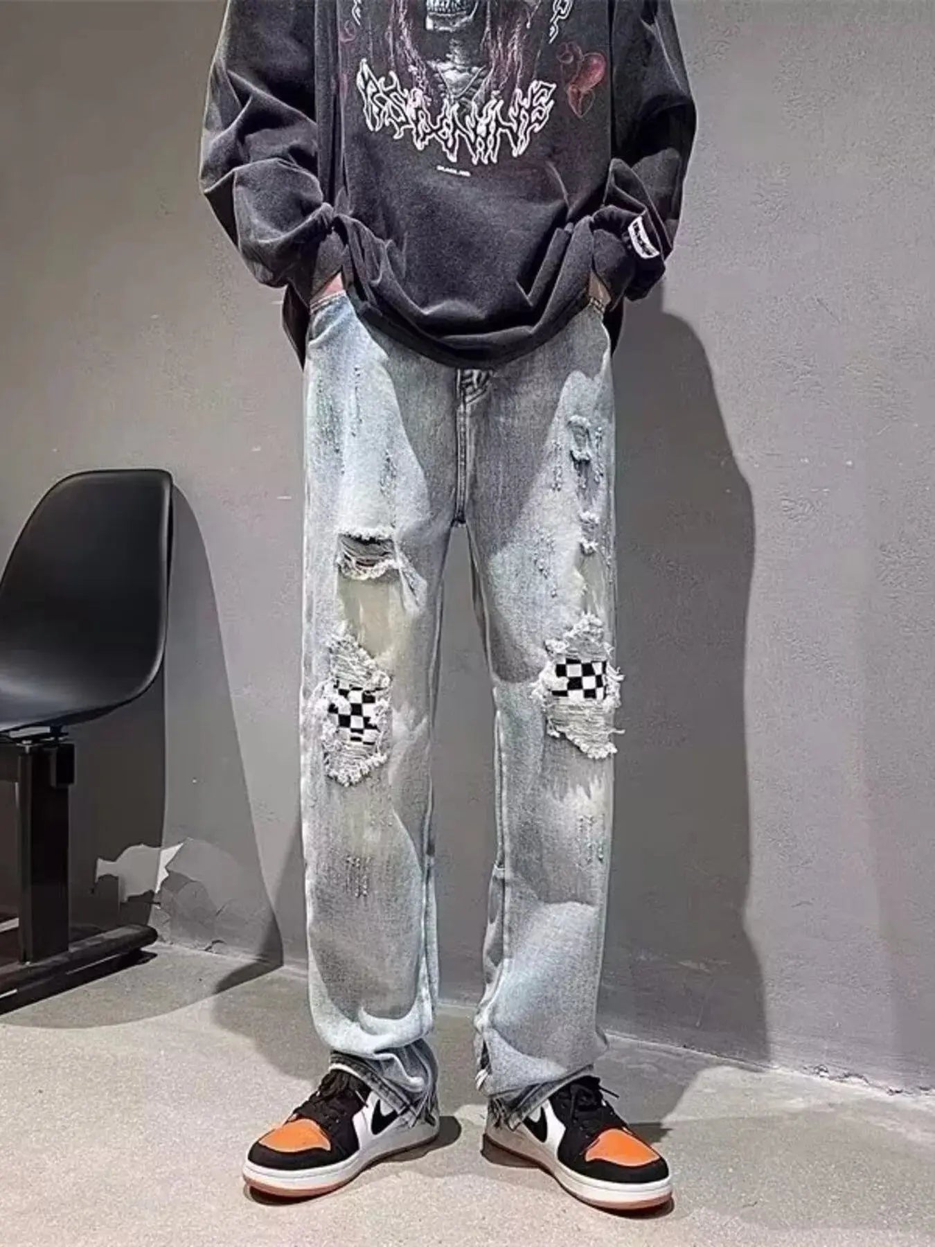 Men's Full Size Ripped Checkerboard Patchwork Jeans Plus Size