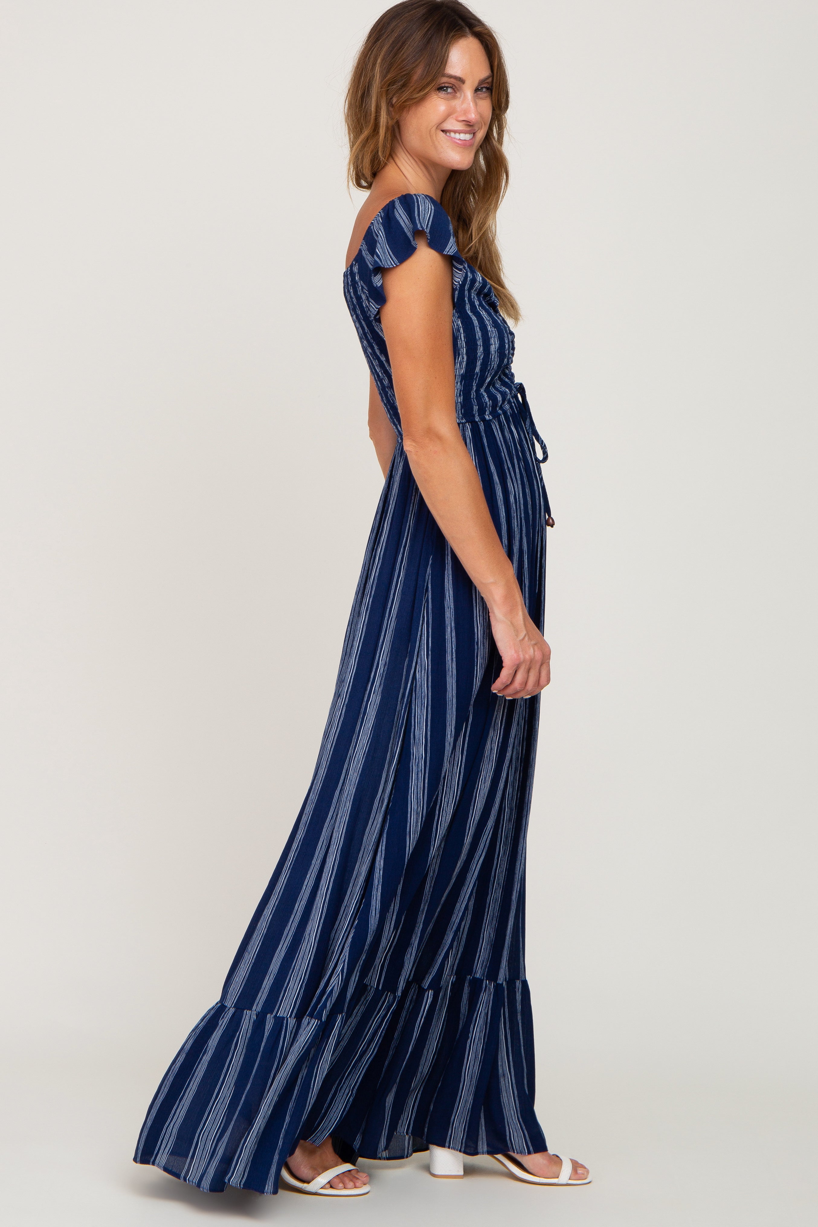 A striped maxi dress featuring an off-shoulder neckline, a front drawstring, a smocked elastic top and a ruffle bottom.