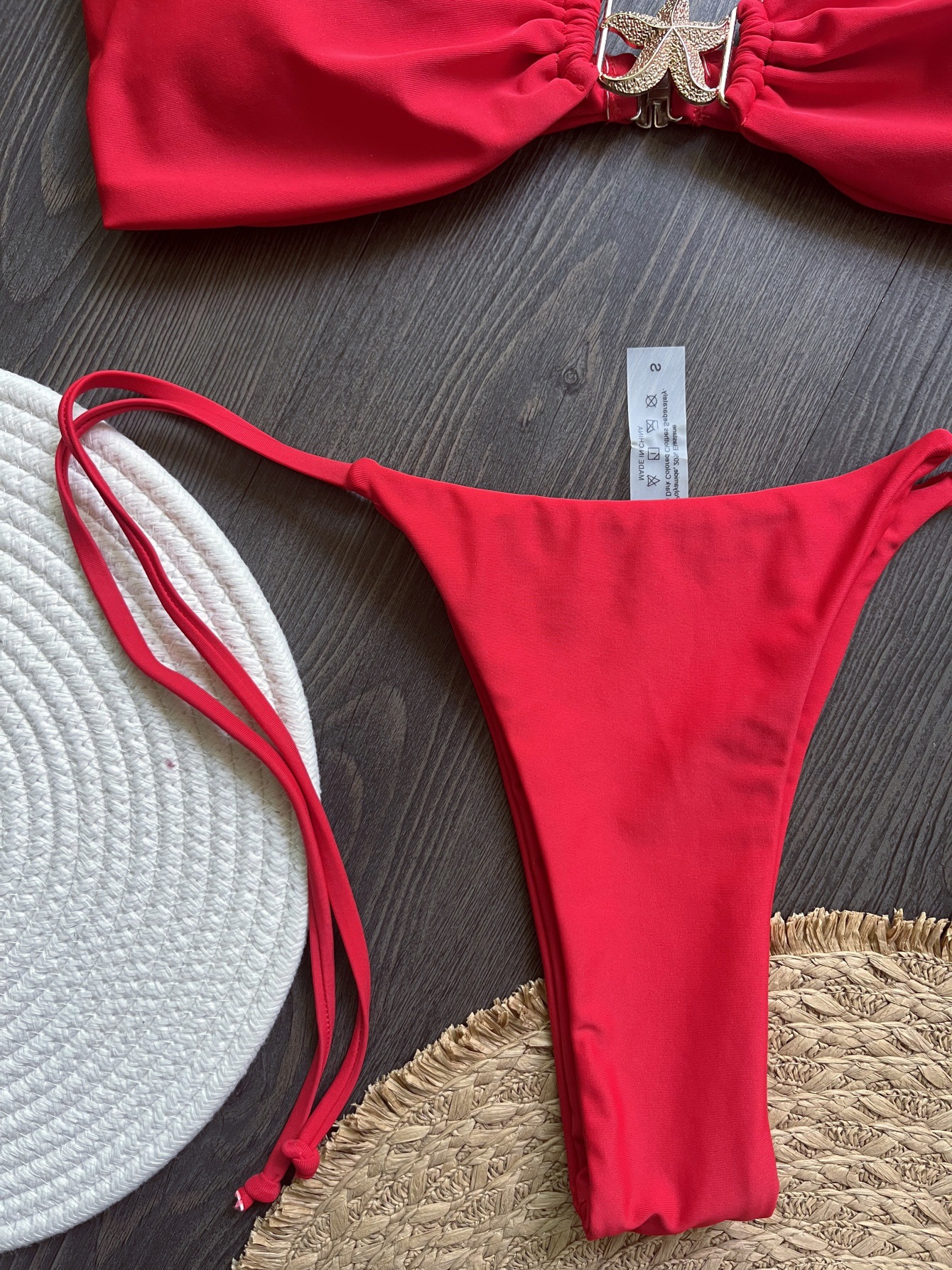 This hot pink, solid-color bikini is crafted from durable nylon fabric designed for quick-drying comfort during summer beach and pool days. The strapless top features a ruched bandeau silhouette with a center tie and a gold-tone five-pointed star accent, delivering a bold boho-inspired focal point. The bottom provides a clean, minimal silhouette with secure coverage and comfortable movement.