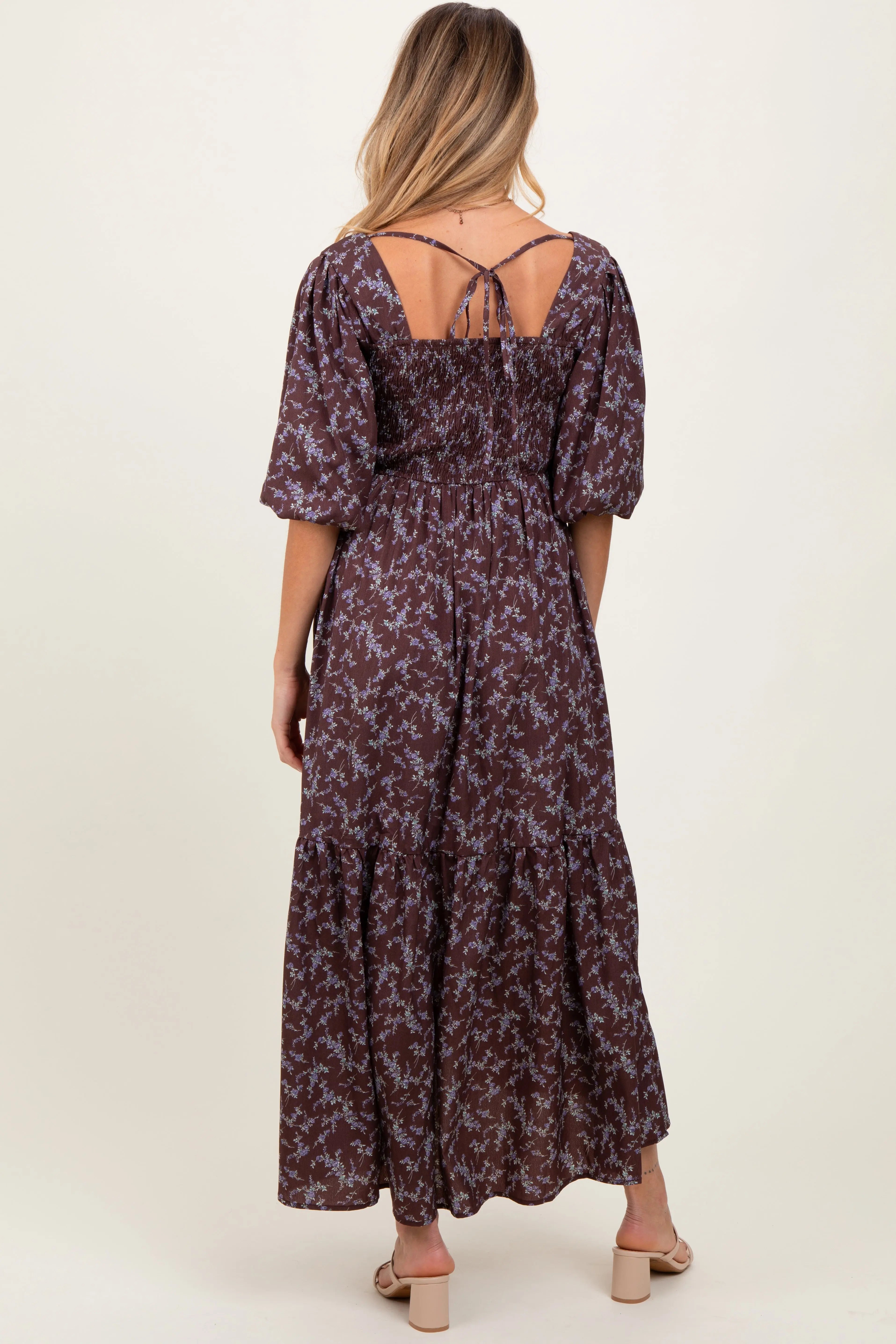 Embrace effortless elegance with our Plum Floral Smocked Hi-Low Puff Sleeve Maternity Maxi Dress. Crafted for comfort and style, this dress features a trendy square neckline and smocked bodice that beautifully adapts to your growing bump. The charming plum base is adorned with delicate floral prints, adding a feminine touch. Puff sleeves create a soft, romantic silhouette, while the hi-low hemline offers a flattering flow and easy movement. Perfect for everyday wear or special occasions, this lightweight, breathable dress will keep you feeling confident and comfortable throughout your pregnancy. Pair it with sandals or heels for a chic look!