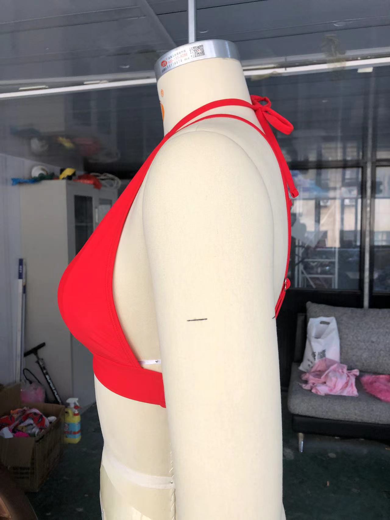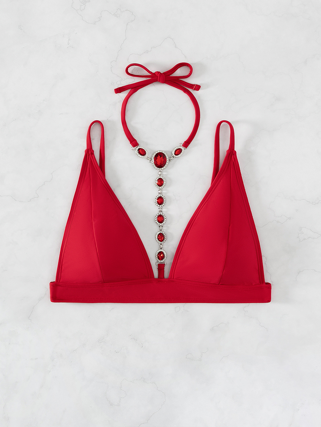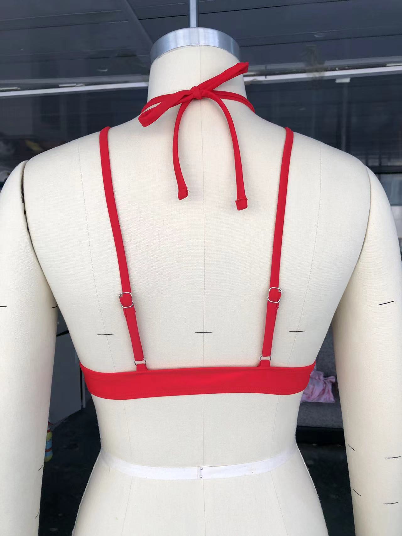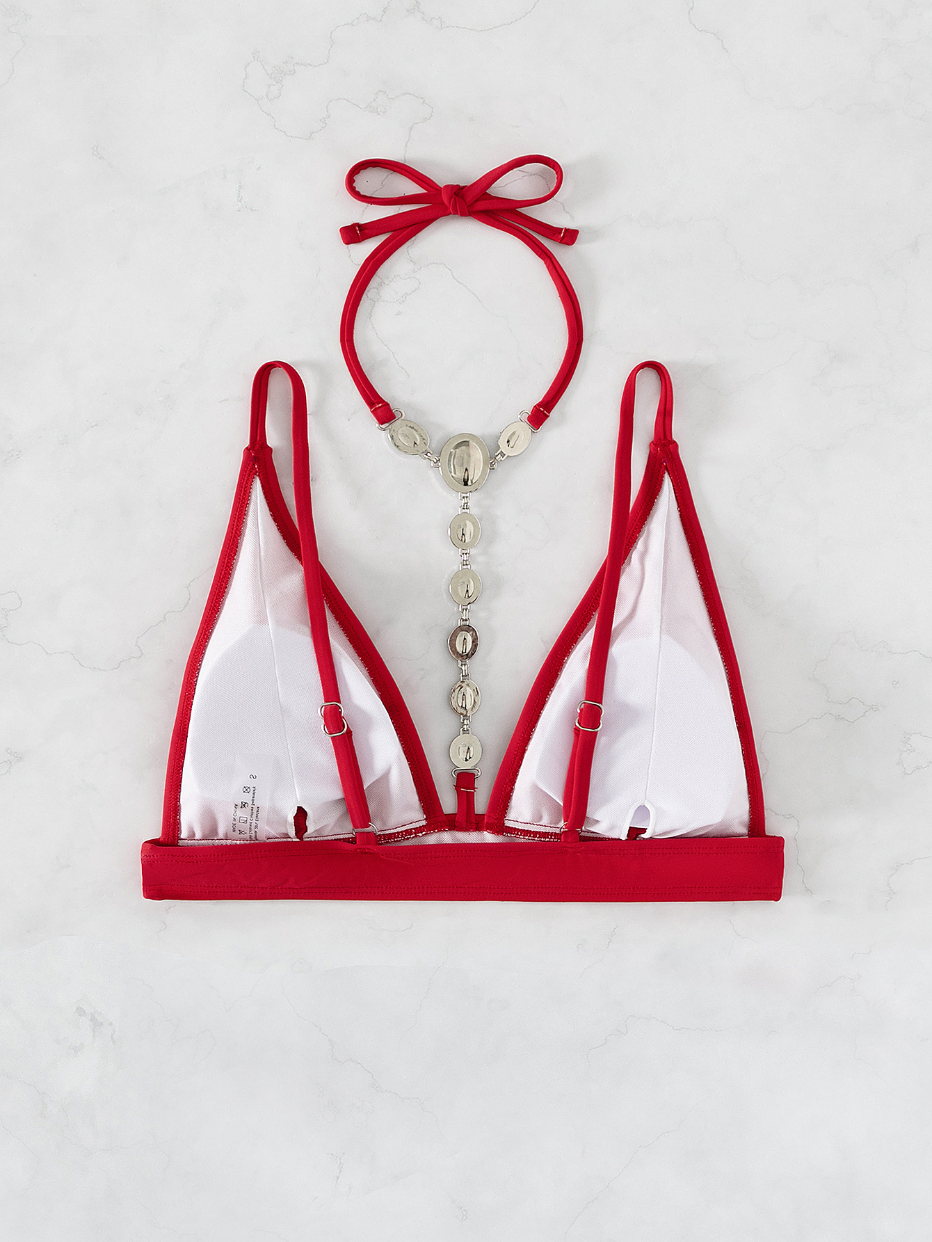 Boho-inspired and vacation-ready, this red nylon bikini offers a comfortable, quick-drying fit for summer days at the beach or pool. The top features a plunging halter with regular straps and a slim front connector, complemented by a subtle metal chain detail at the neckline. The bottom presents a high-cut silhouette that flatters the hips while maintaining a secure, adjustable feel through its tie-side design.