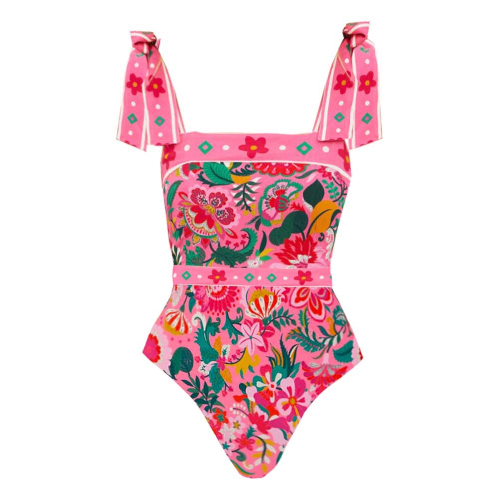 Printed Bow Shoulder Strap One Piece Swimsuit Women