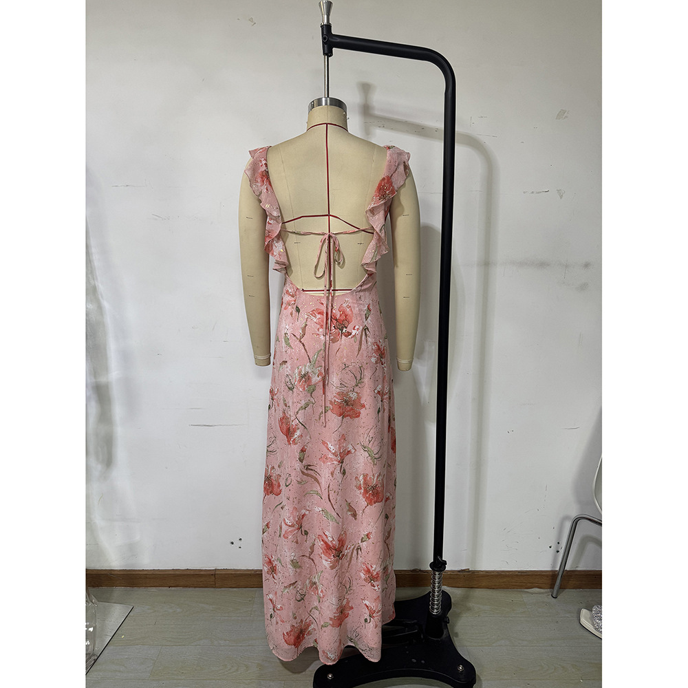Printing Slip Dress Women Summer Sexy Gentle Waist Trimming Lace up Backless Large Swing Dress