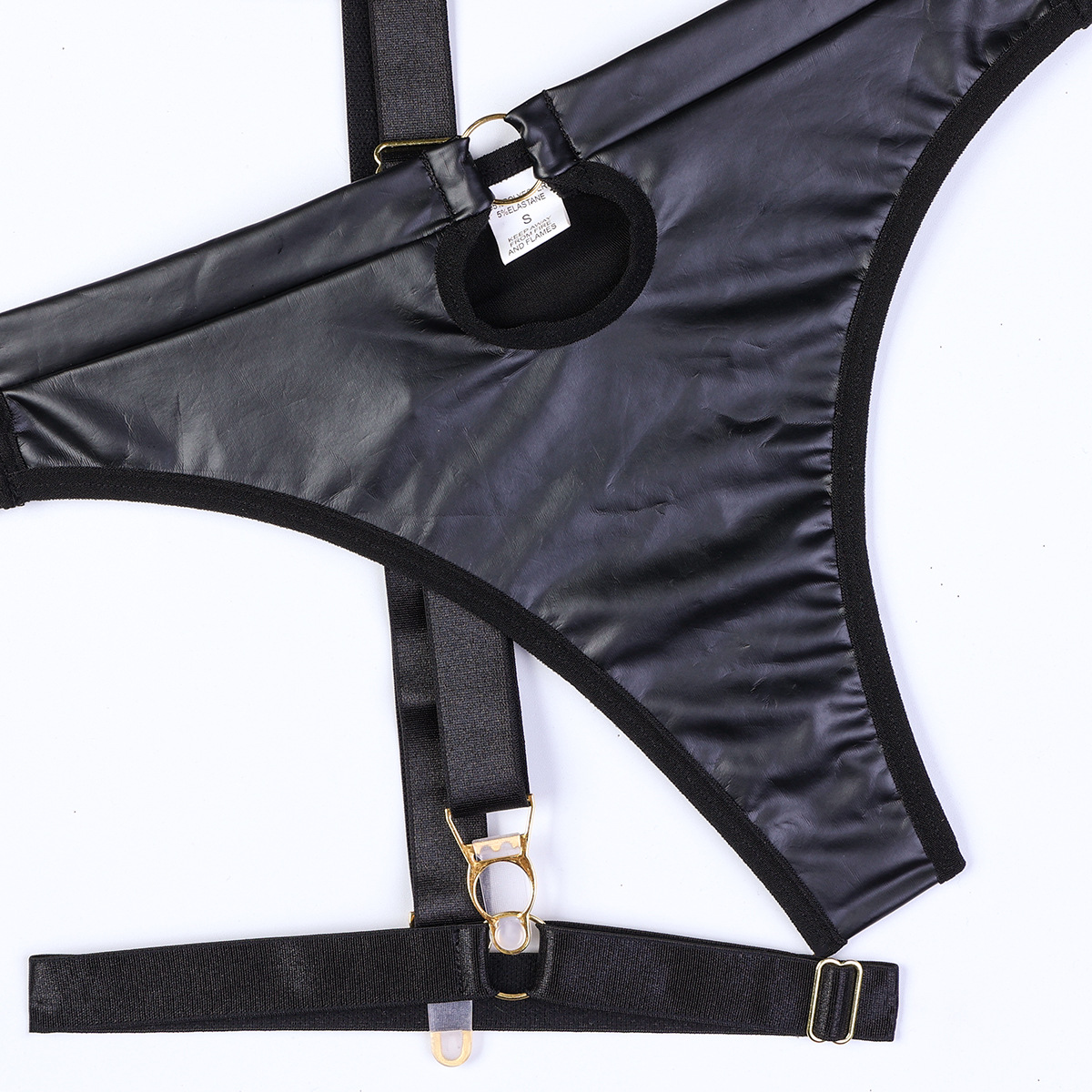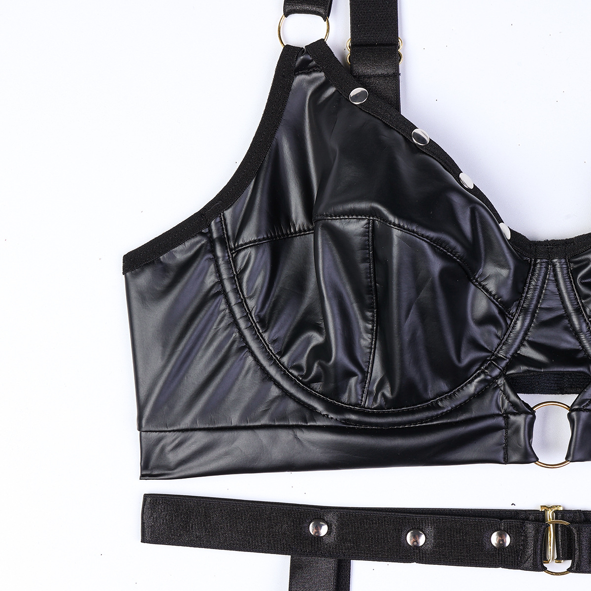 Punk Series Three Piece Set of Sexy Lingerie Black Faux Leather Subdued Leather Metal Stamping Heavy Industry