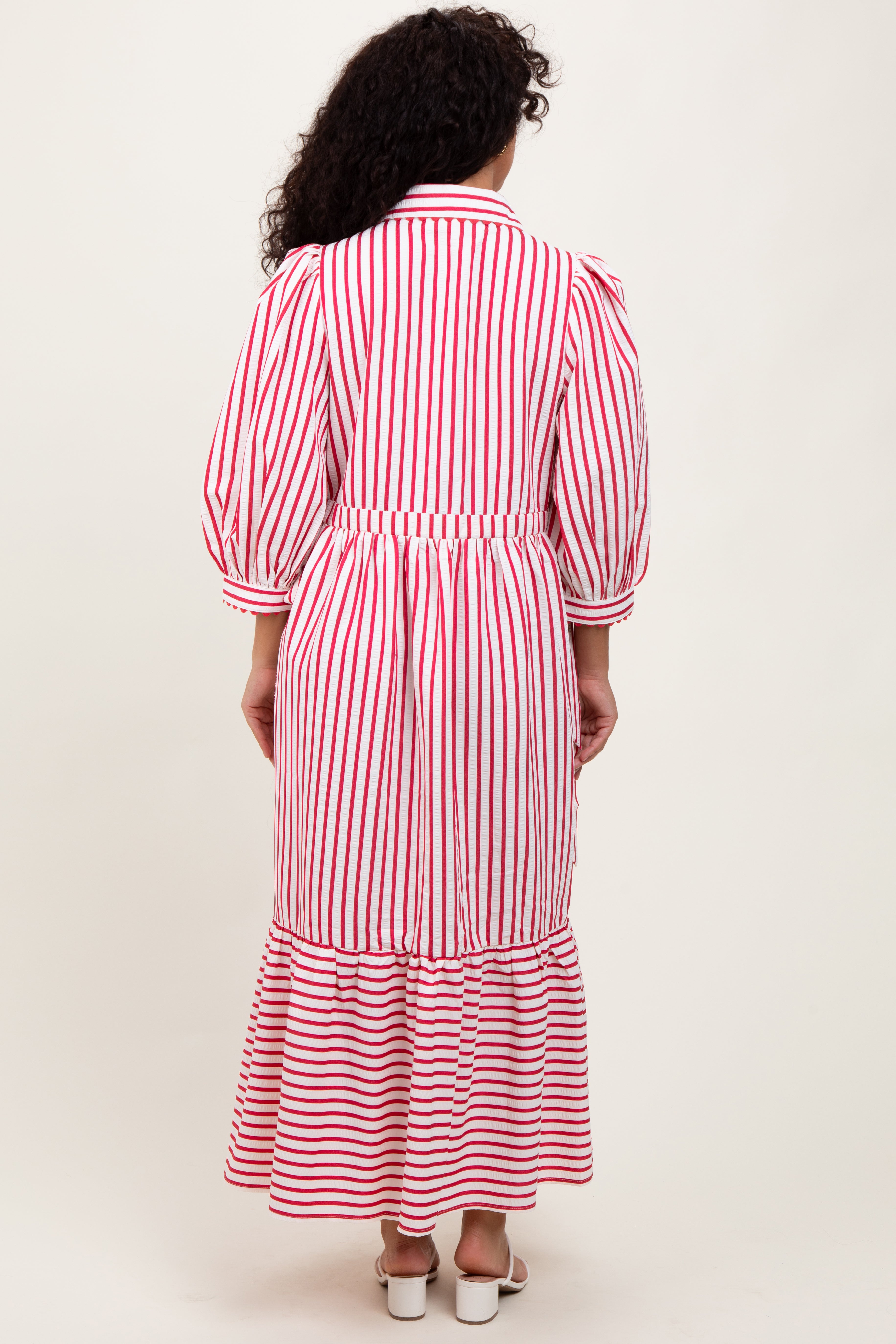 Step into effortless style with this striped collar maxi dress, designed for comfort and elegance. Featuring a classic button-down front and a flattering fitted waist, this dress enhances your silhouette while allowing easy movement. The long sleeves have a relaxed puff detail with cuffed ends, adding a touch of sophistication. The maxi length is finished with a wide ruffle hem, creating a playful and feminine flair. Perfect for casual outings or dressier occasions, this versatile piece pairs beautifully with sandals or heels. Crafted from lightweight, breathable fabric, it ensures all-day comfort. Embrace timeless charm with this stylish maxi dress.