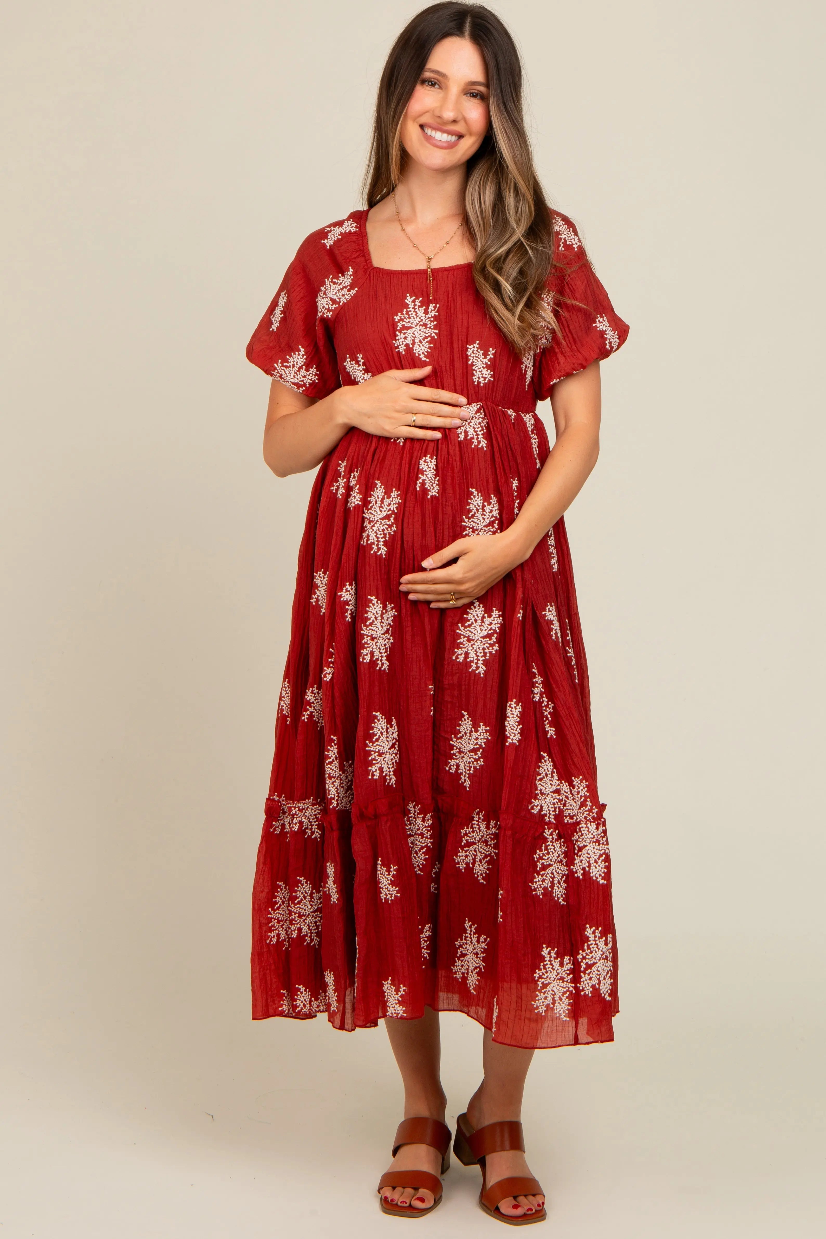 Rust Floral Print Ruffle Hem Maternity Midi Dress
