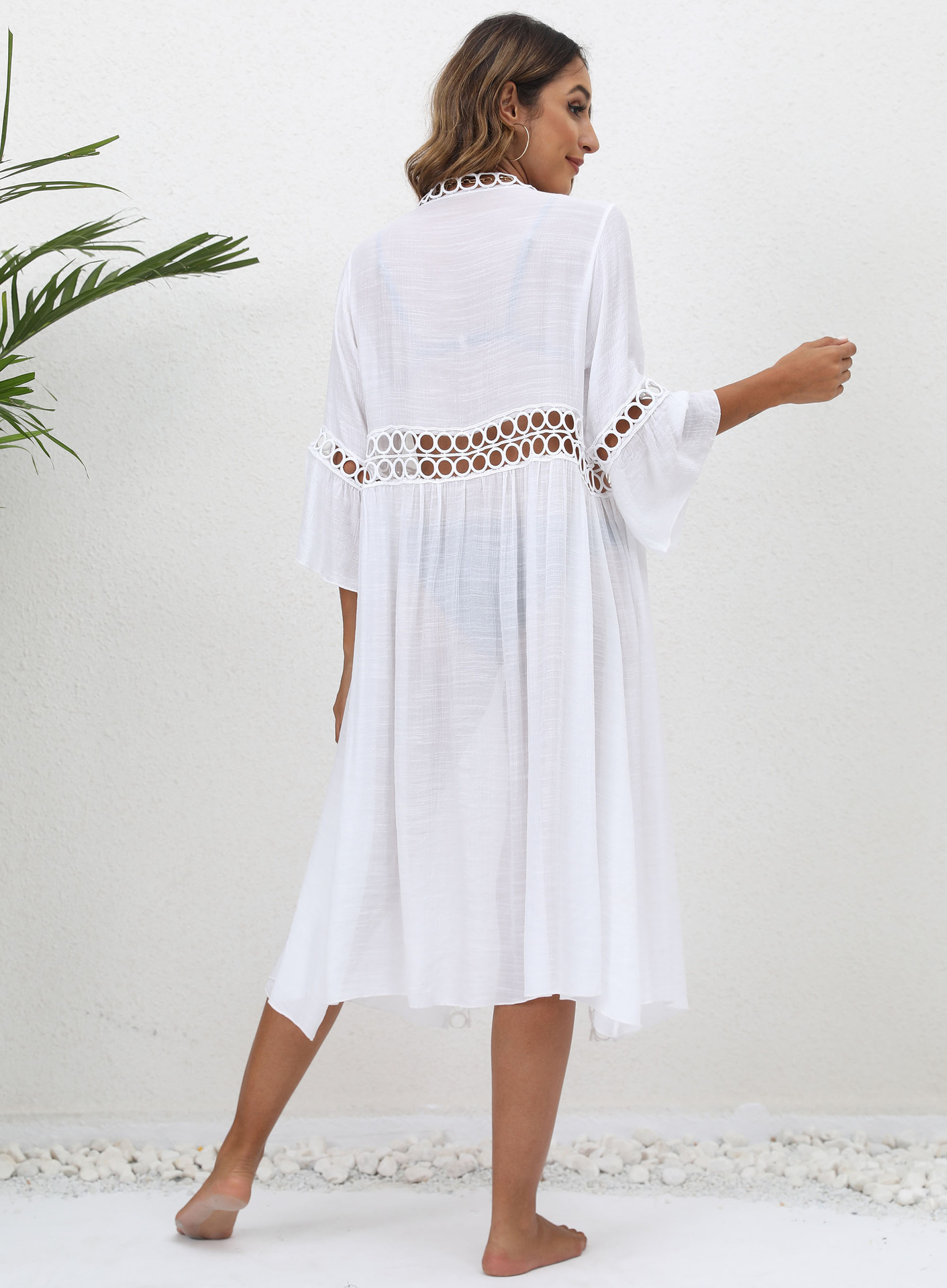 This lightweight boho outerwear is designed for summer days at the beach or on vacation. It features a loose, draped silhouette that layers over swimsuits or casual tops, with three-quarter sleeves and a midi-length hem for versatile coverage.