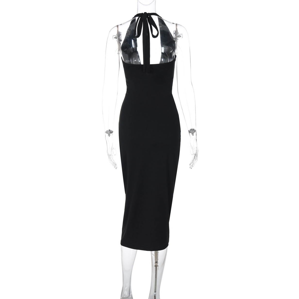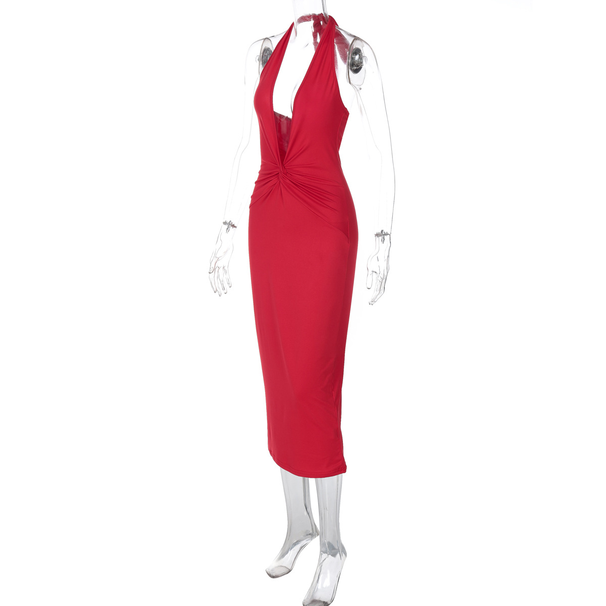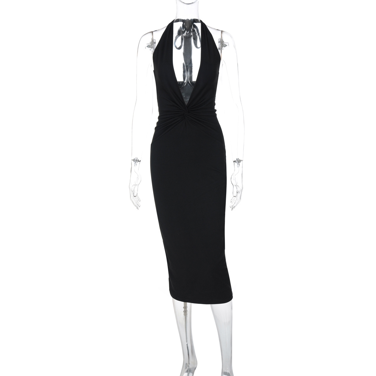 This sleeveless, bodycon midi dress is crafted from polyester and designed in a solid color for a clean, contemporary look. The halter neckline features a dramatic deep V plunge and a subtle twisted knot at the front, creating a flattering silhouette. The backless design adds allure while maintaining versatility for warm-weather events. The dress offers a slim, streamlined fit through the waist and hips, finishing at a mid-calf length for a refined, street-ready profile. Perfect for party and club occasions, it pairs well with high heels and minimalist accessories, providing a polished yet bold statement for summer evenings.