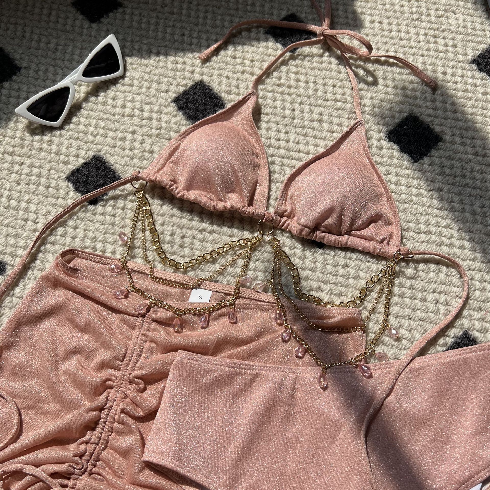 Sexy Drawstring Strap Shiny Cloth Diamond Lanyard Three Piece Swimsuit Bikini