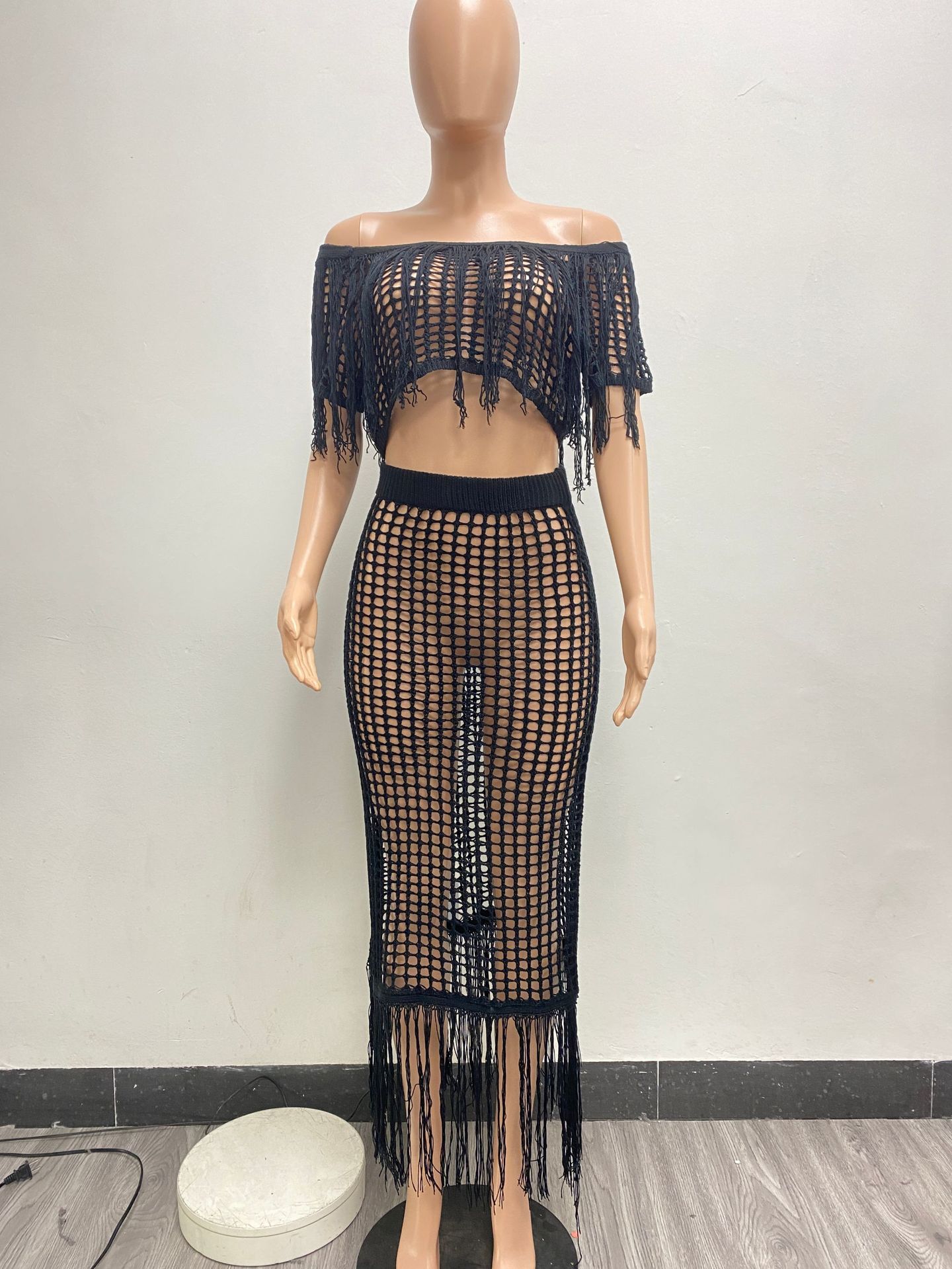 Sexy See through Knitted Hand Crochet Tassel Beach Suit