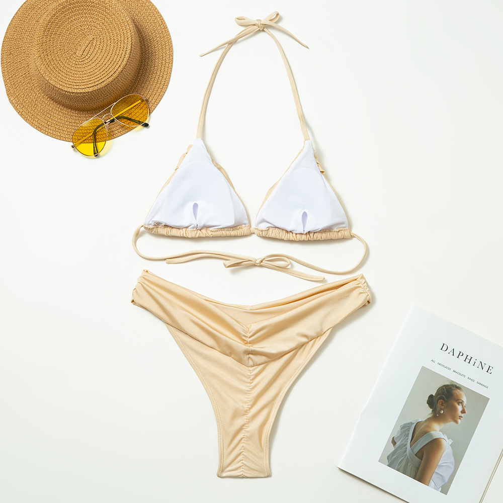 Sexy Solid Color Nylon Bikini Strap Pleated High Waist Split Swimsuit for Women