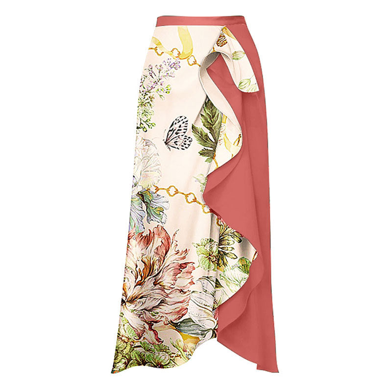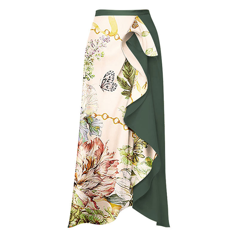 Elevate your summer poolside look with this retro-inspired swimsuit and chiffon skirt set. The one-shoulder silhouette features a self-tie strap and an asymmetric neckline that flatters the collarbone. The swimsuit is crafted from polyester with a floral print on a light cream base, accented by deep green trim along the edges. The coordinating skirt adds a graceful chiffon overlay with a wrap-style ruffle that drapes at the hip for movement and coverage.