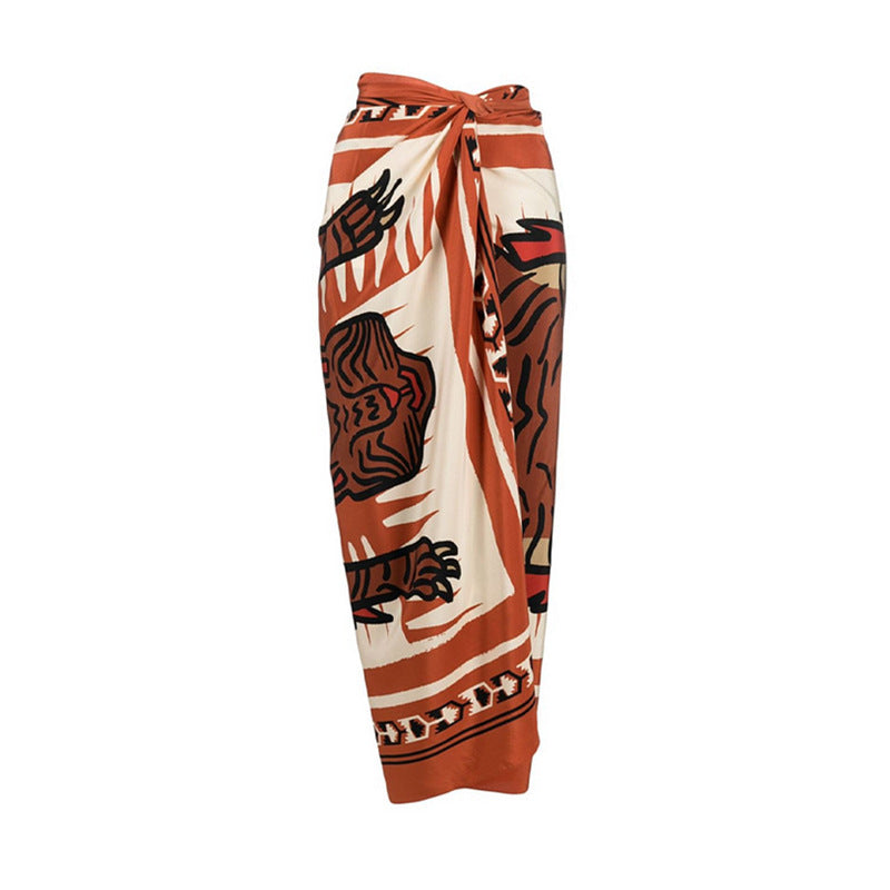 - Color: terracotta brown; pattern: solid with ruched, asymmetric elements