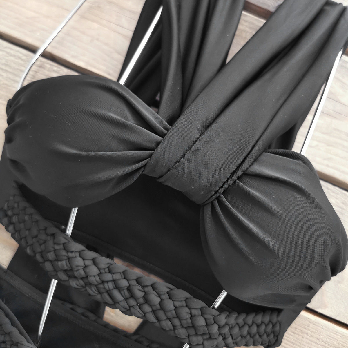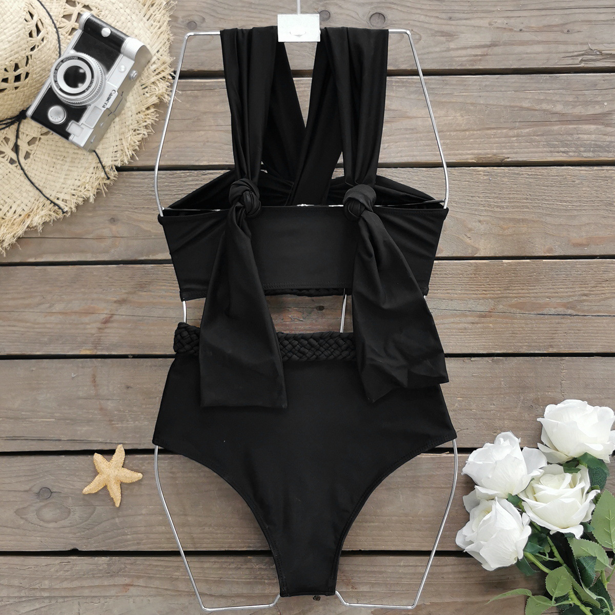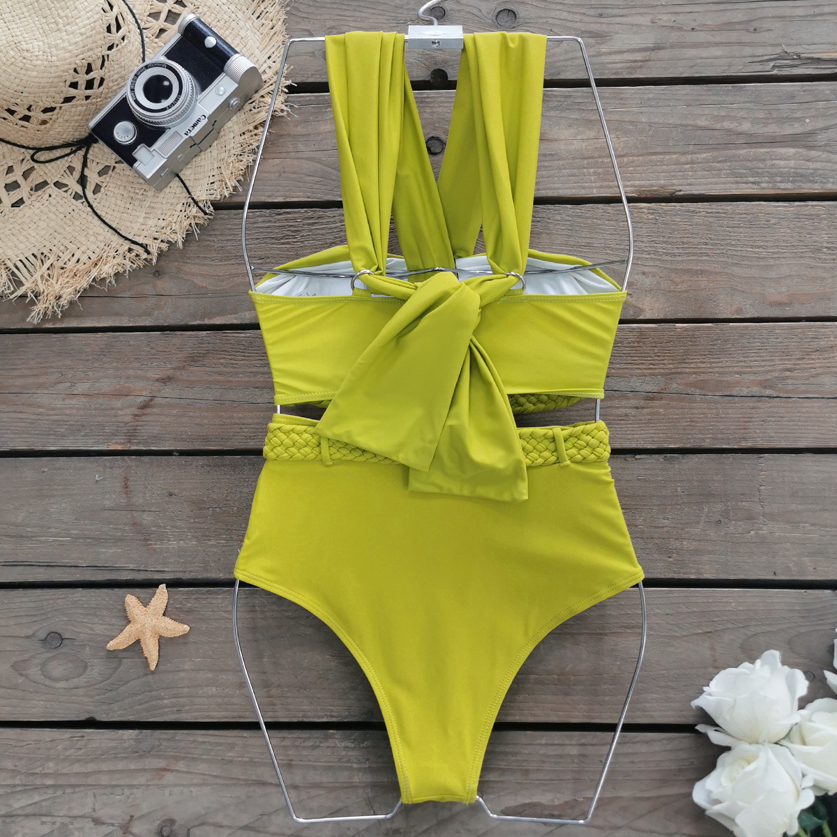 This solid color swimsuit delivers a boho-inspired vacation look with contemporary comfort. Crafted from polyester, the design emphasizes durability and shape retention for long days at the beach or by the pool. The halter strap ties at the neck, and a bold front knot detail creates a flattering silhouette. A high-waist bottom provides full coverage, while a braided rope belt wraps the waist for added texture and visual interest. The cohesive solid color ensures a streamlined, cohesive appearance that pairs easily with cover-ups and accessories.