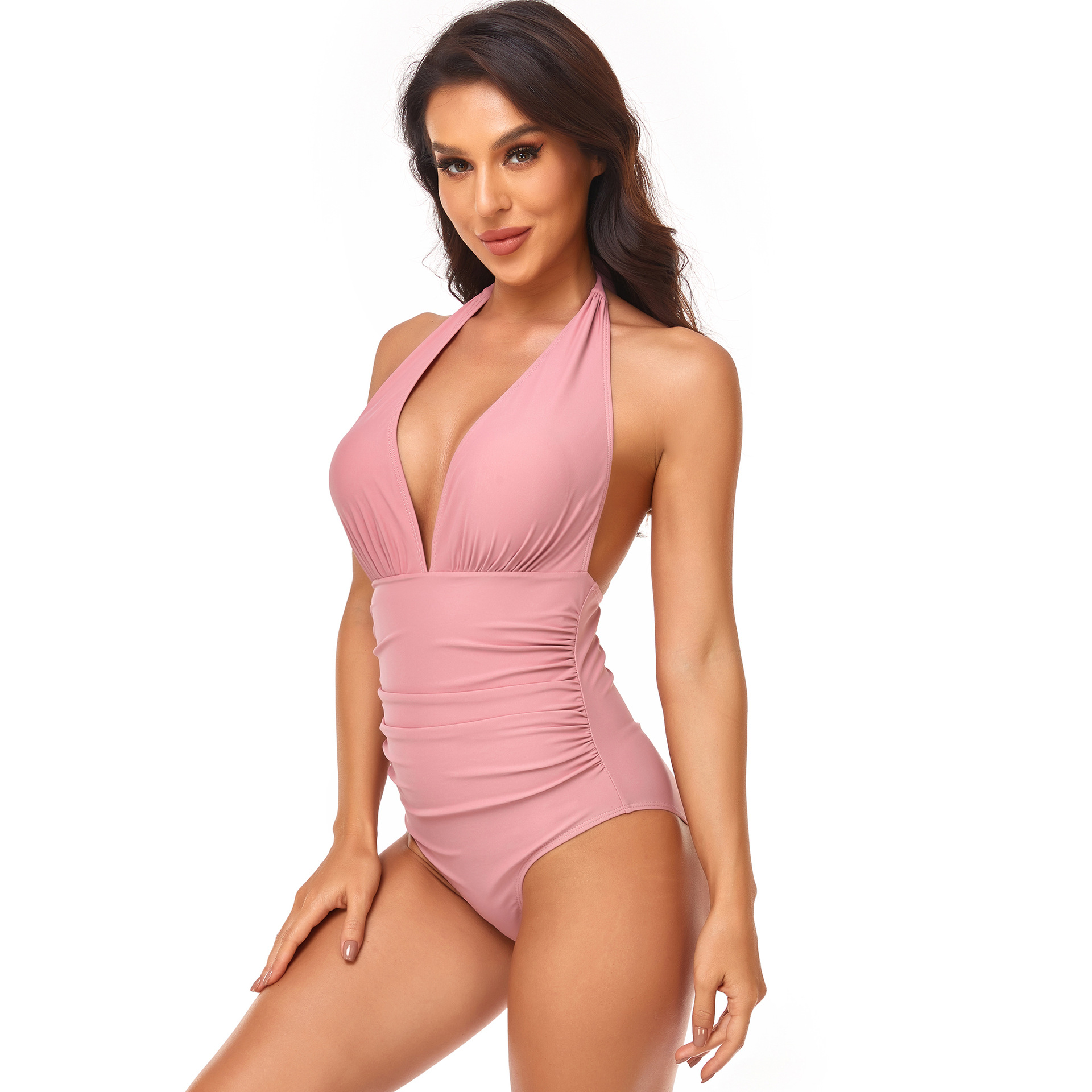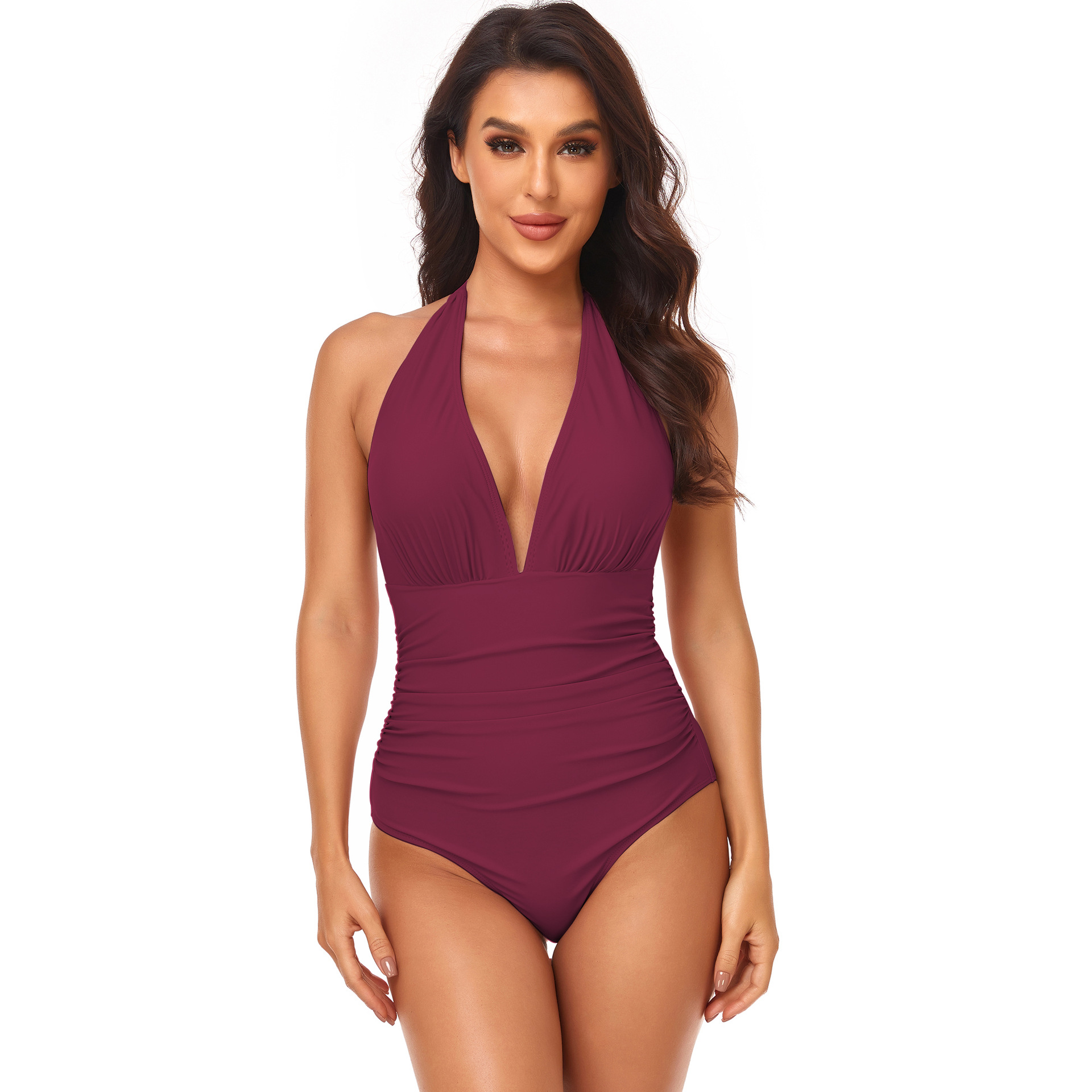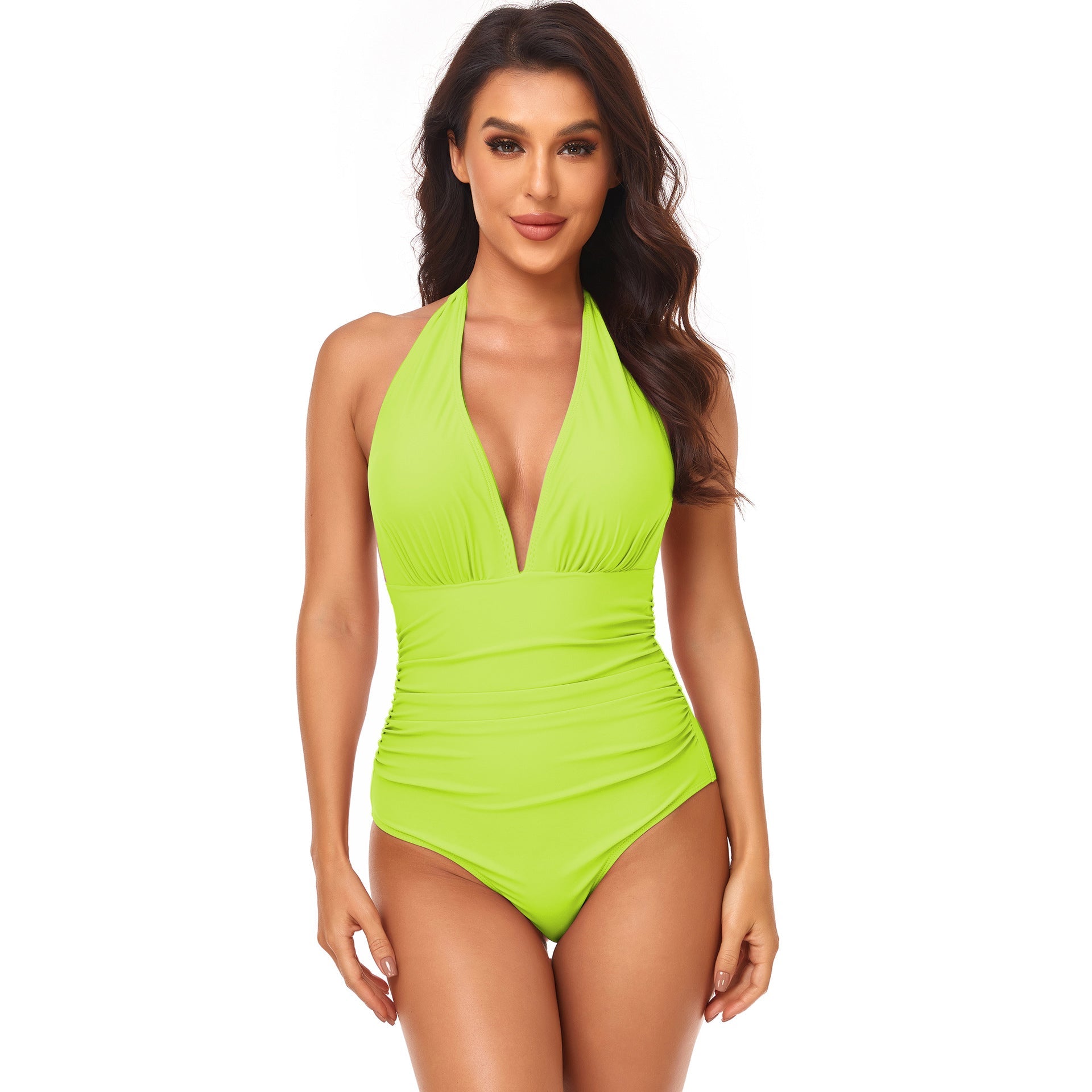 Solid Color One Piece Swimsuit Pleating Halter Swimsuit Popular One Piece Swimsuit